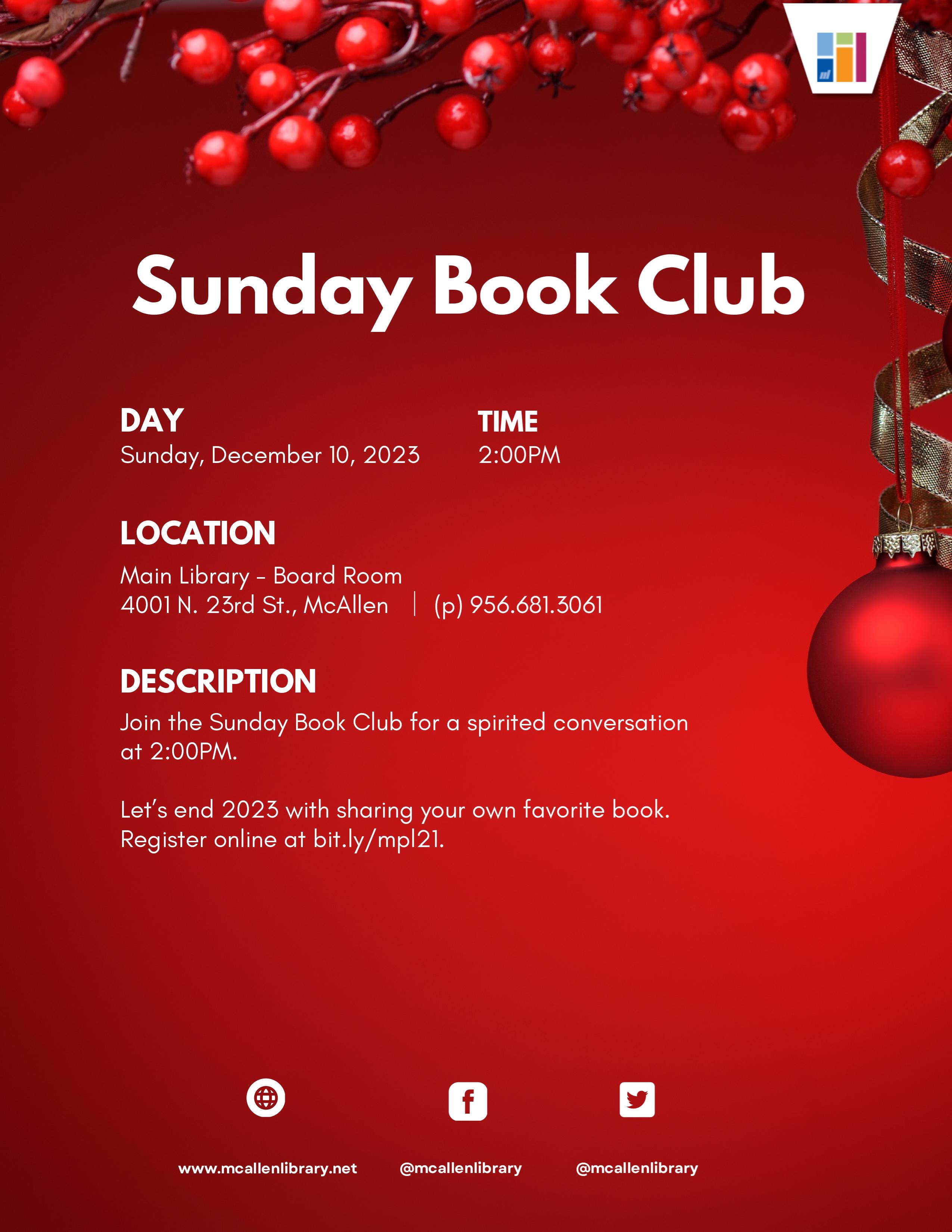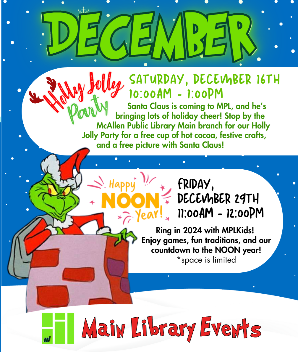 Programs MPL Gaming Club December 5th & 19th at 5:30 PM Basic Computer Classes December 6th & 13th at 2 PM MPL Anime/ Manga Club December 7th at 7 PM Cook Book Club December 10th at 7 PM Unfolded Poetry Workshop (Spanish) December 12th at 6:30 PM Knitting Group (Lark Branch) Tuesdays at 2 PM DYI Christmas Cards (Lark Branch) December 6th at 6 PM Holiday Movie at the Library (Lark Branch) December 7th at 6 PM Adult Painting Class (Lark Branch) December 9th at 1:30 PM Virtual Painting Class (Lark Branch) December 15th at 2 PM Computer Class (Palm View Branch) December 4th & 11th at 1 PM Clase de computacion (Palm View Branch) December 6th & 13th at 1 PM Adult Coloring (Palm View Branch) December 12th at 12 PM Painting with Ms. Susie (Palm View Branch) December 14th at 12:30 PM Coffee & Crochet Club (Palm View Branch) December 20th at 11 AM