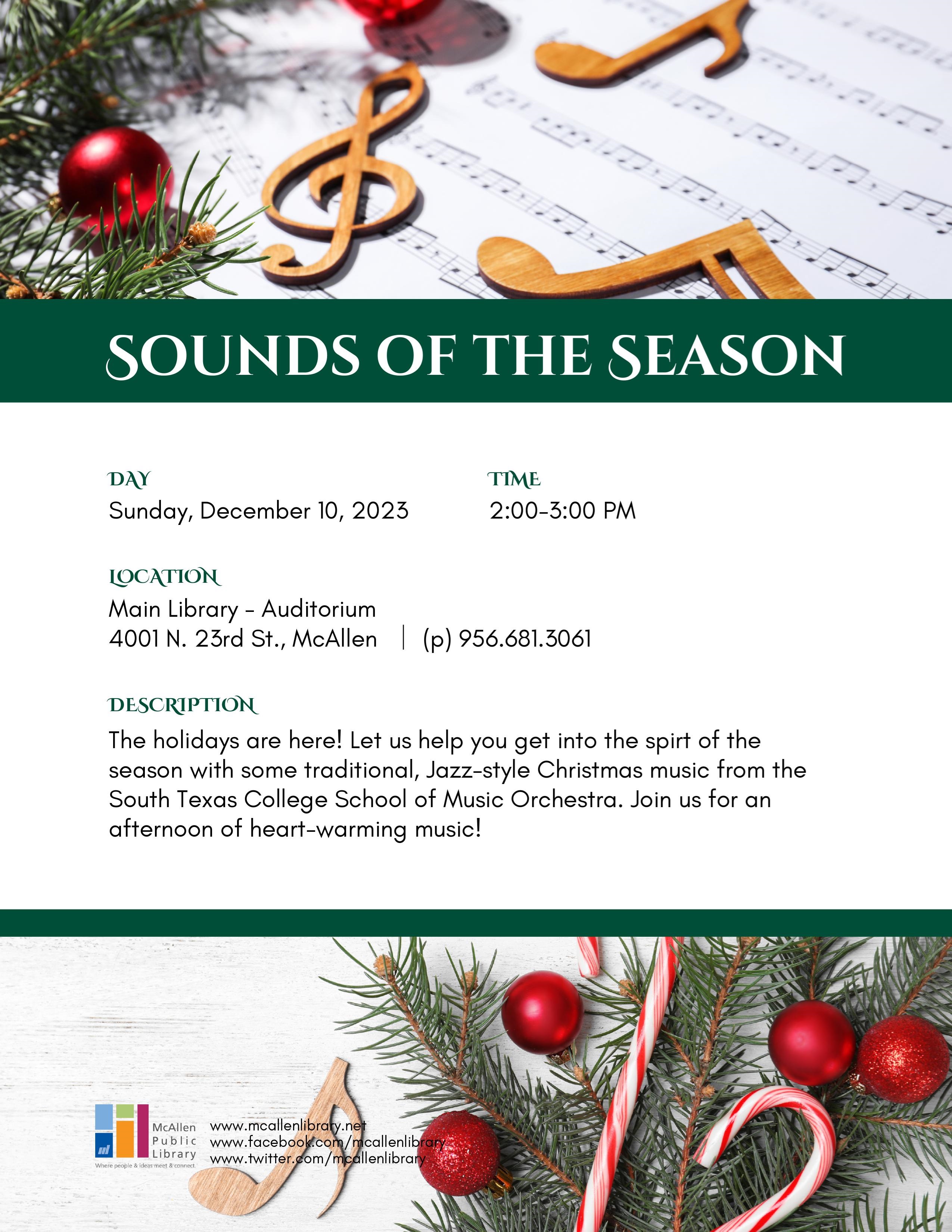 Programs Sunday Storytime December 3rd & 17th at 2 PM Baby Storytime December 4th, 11th, & 18th at 1 PM Toddler Time December 5th & 12th at 10 AM STEM Sunday December 10th at 2 PM Postpartum Support Circle December 12th at 5:30 PM Tiny Tots Holiday December 19th at 10 AM Ginger Bread Houses December 23rd at 11 AM Winter Scavenger Hunt December 26th All Day Coloring Day December 27th All Day Movie Marathon December 28th All Day Family Storytime (Lark Branch) Tuesdays at 6:30 PM Once Upon a Time (Lark Branch) Wednesdays at 11 AM Once Upon A Time (Lark Branch) December 4th, 11th, & 18th at 11 AM Crafty Kids (Lark Branch) December 6th & 20th at 6 PM Coloring Day (Lark Branch) December 13th at 6 PM La Hora de los Cuentos (Palm View Branch) December 5th & 12th at 1 PM Coloring Day (Palm View Branch) December 6th at 6 PM Toddler Time the Gingerbread Man (Palm View Branch) December 7th at 11 AM In-B-Tween Club (Palm View Branch) December 7th at 5 PM Toddler Time (Palm View Branch) December 14th at 11 AM Toddler Playdate (Palm View Branch) December 19th & 21st at 11 AM
