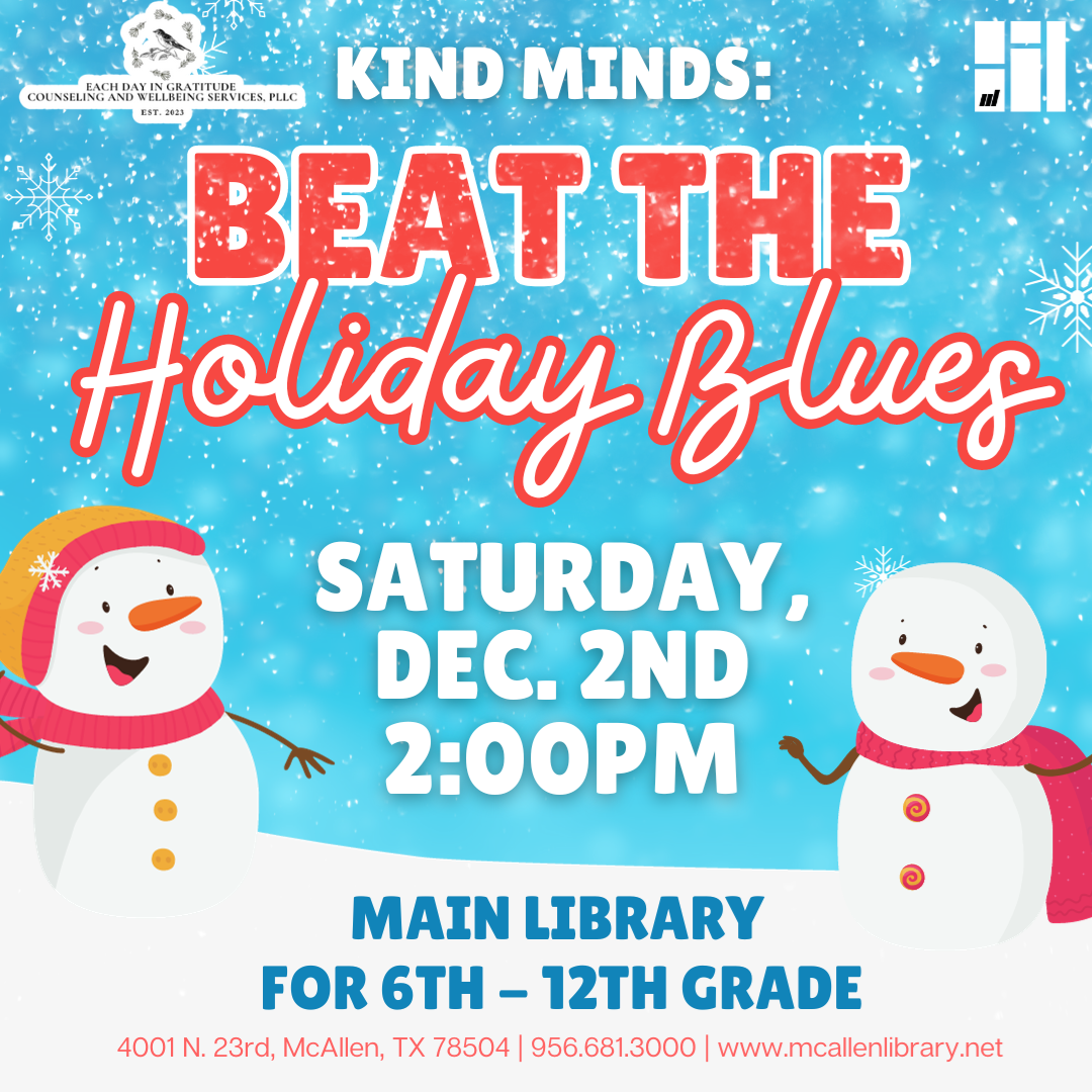 Teen Programs Program Highlight: Kind Minds December 2nd at 2 PM As the holiday season approaches, it's crucial to take care of your mental well being. Join us for a workshop where you can learn tools & techniques to sleigh away depression and anxiety.