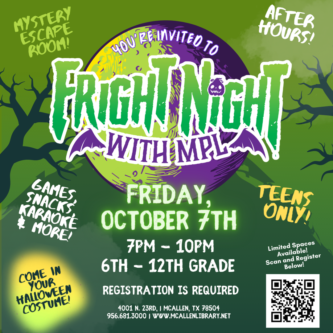 Teen Programs Program Highlight: Fright Night Friday October 7th at 6PM Ready to have a scary good time? Join us for a spooktacular teens-only after-hours costume party at the library! Have an eerie evening full of fun, snacks, a thrilling escape room and more! Space is limited. Registration required.