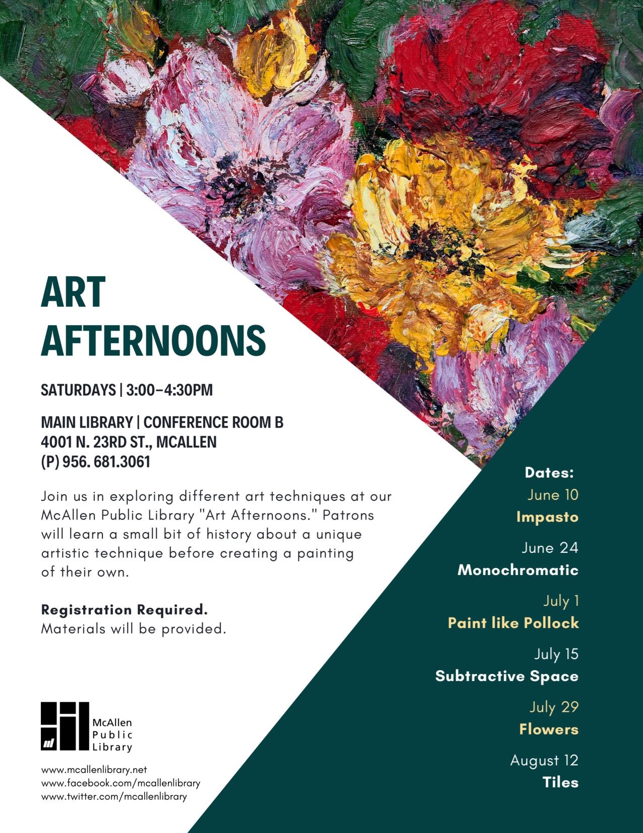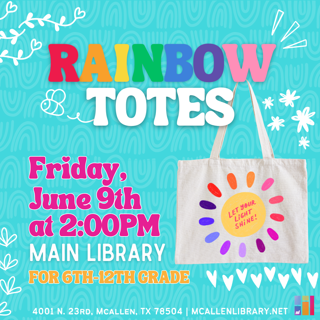 Adult Programs Region One ESL + Citizenship Class Mondays & Wednesdays at 9AM MPL Gaming Club June 6th & 20th at 5:30 PM Basic Computer Class June 7th & 14 at 3 PM Art Afternoons June 10th & 24th at 3 PM Resilience and Remembrance the History of Juneteenth June 12 at 7 PM Knitting with Friends for Beginners June 14th at 5 PM History of the RGV LGBTQIA June 15th at 6:30 PM Texas Master Naturalist Series Passion Vine Diaries of the RGV June 13th at 3 PM Sunday Cinema Hidden Figures June 18th at 6 PM Knitting Group (Lark) Tuesdays at 2 PM Sketching Class (Lark) June 6th at 6 PM Adult Coloring (Lark) June 13th at PM Adult Painting Class (Lark) June 17th at 1:30 PM Virtual Painting Class (Lark) June 20th at 2 PM Game Day (Lark) June 27 at 6 PM Basic Computer Classes (Palm View) Mondays at 1 PM Clases de Computación Básica (Palm View) Wednesdays at 1 PM Knitting with Friends for beginners (Palm View) June 14th & 28th at 5 PM Painting Together (Palm View) June 15th at 2 PM Red, White, and Blue Canva Can Do! (Palm View) June 22nd at 11 AM Strengthening Families (Palm View) June 29 at 2PM