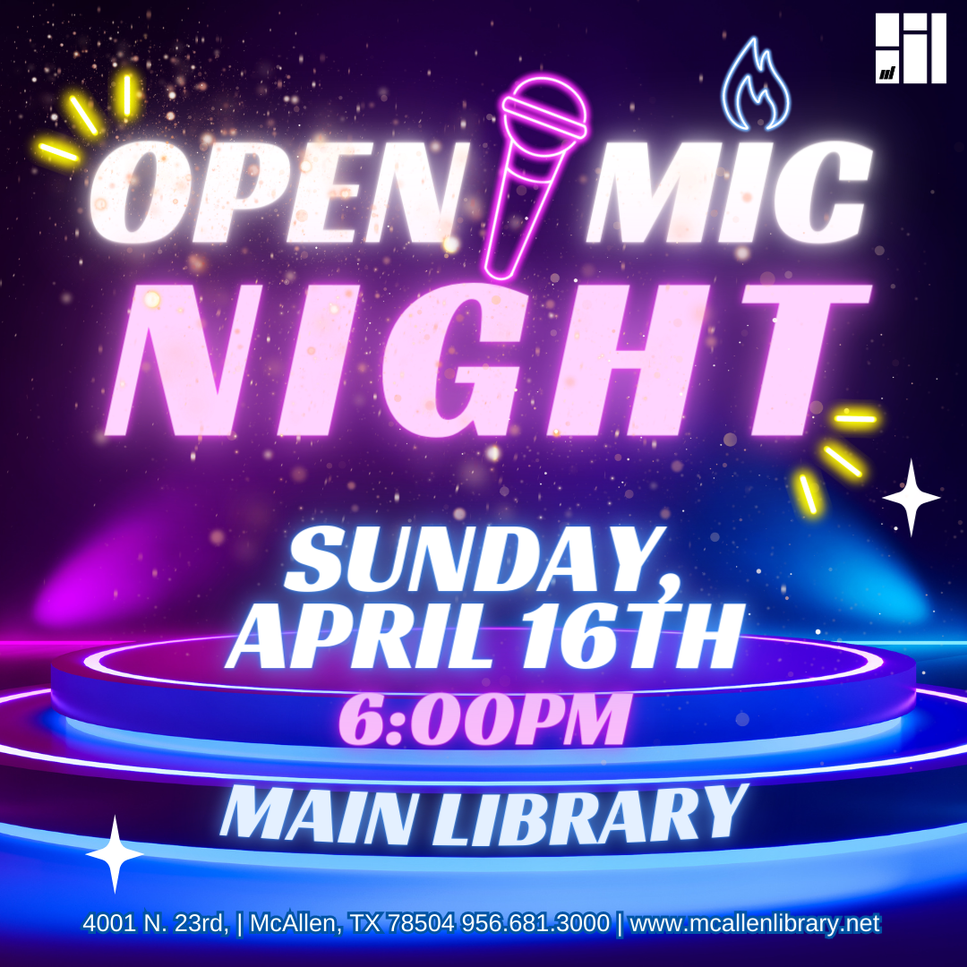 Teen Programs Program Highlight: Open Mike Night Sunday, April 16th at 6 PM Teens, let your voice be heard! Bring your poetry, stories, comedy, music, or art to our Open Mic Night. All ages are welcome to celebrate National Poetry Month with us.
