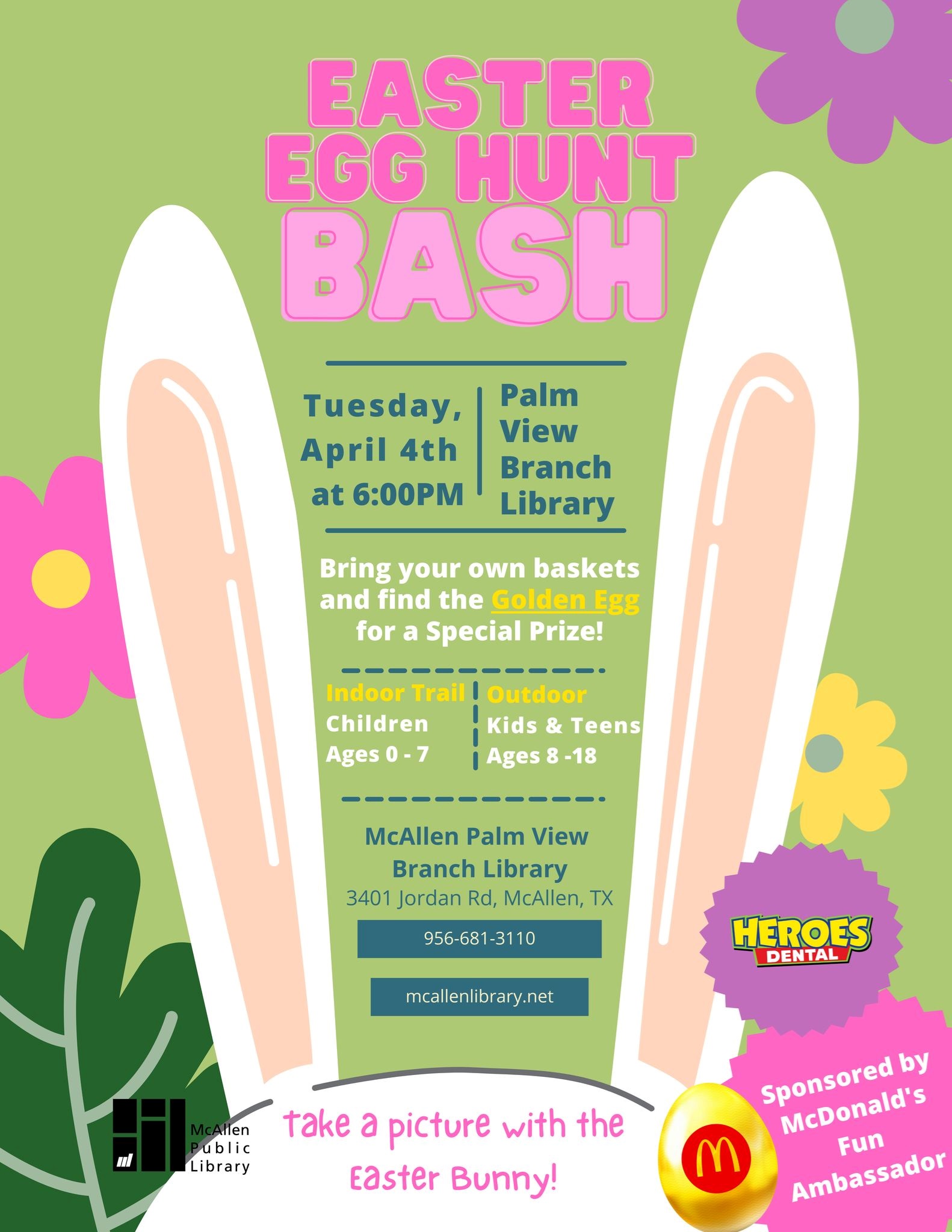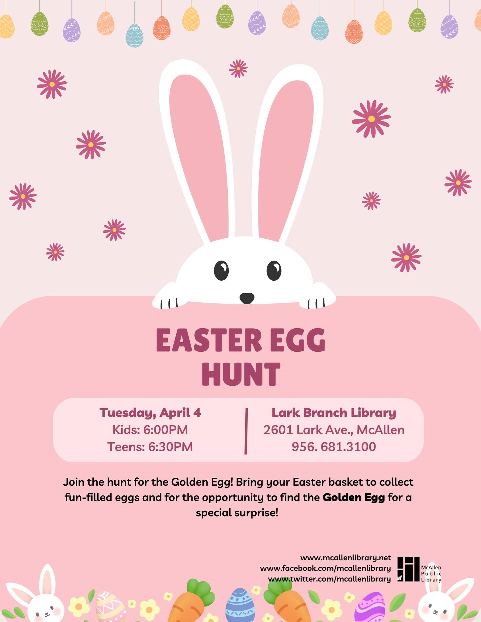 Children's Programs Program Highlights: Lark and Palm View Branch Easter Bunny Hunt April 4th starting at 6 PM Mark your calendars! Lark Branch and Palm View Branch Libraries are hosting fun-filled Easter egg hunts for kids and teens on Tuesday, April 4th! It's going to be an amazing time for everyone!