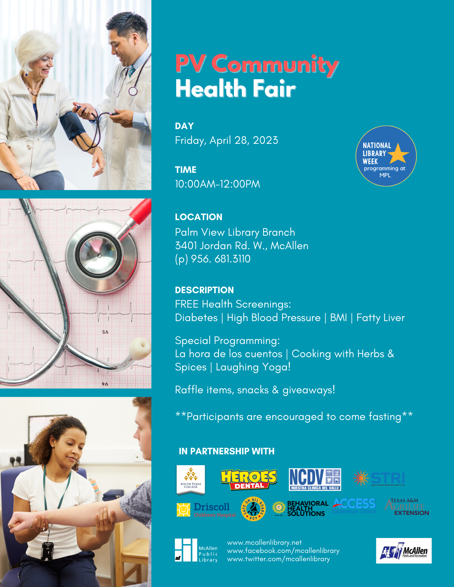 Adult Programs Program Highlight: PV Community Health Fair (Palm View) April 28th at 10 AM Celebrate National Library Week with FREE Health Screenings: blood glucose, high blood pressure, BMI, fatty liver. Join us for special programming: La hora de los cuentos & Cooking with Herbs & Spices! Raffle items, snacks & giveaways!