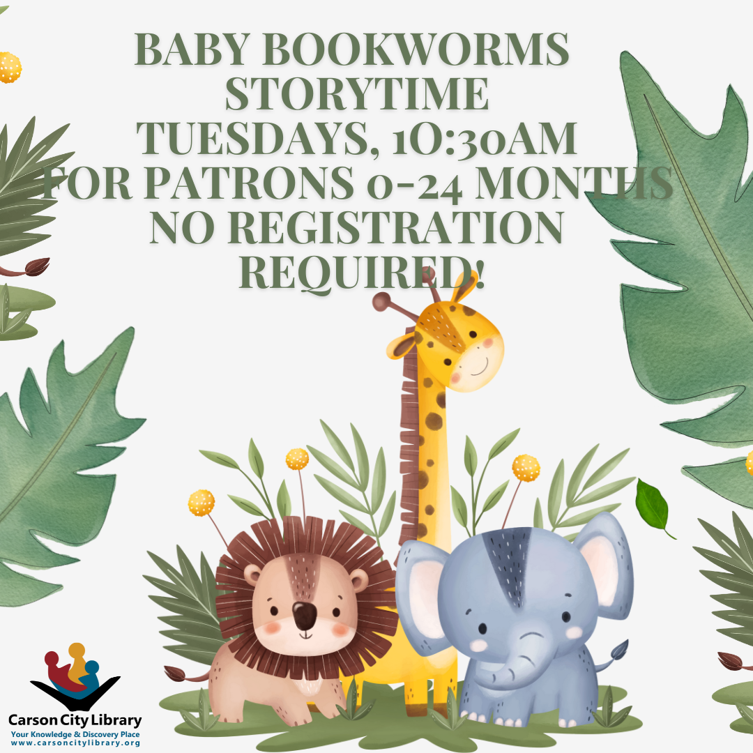 Baby Bookworms Storytime Tuesdays | 10:30 AM Carson City Library Designed for our littlest learners (ages 0–2), Baby Bookworms offers gentle stories, songs, and bonding time for babies and their caregivers. Join us each week for a cozy and welcoming storytime that encourages early literacy and connection through shared experiences. No registration required—just bring your baby and get ready for sweet moments and lots of smiles!