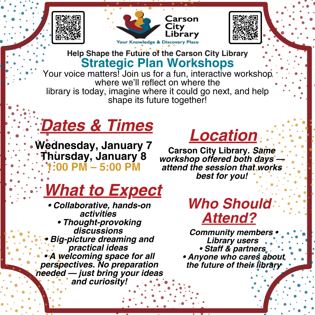 Join Us For Strategic Plan Workshops on January 7th & 8th from 1pm - 5pm Participating in the Winter Reading Challenge? Complete the Strategic Plan Survey by December 18 to earn an extra ticket into our prize raffles! Your feedback helps shape the future of the library and gives you a bonus chance to win—it's a win-win!