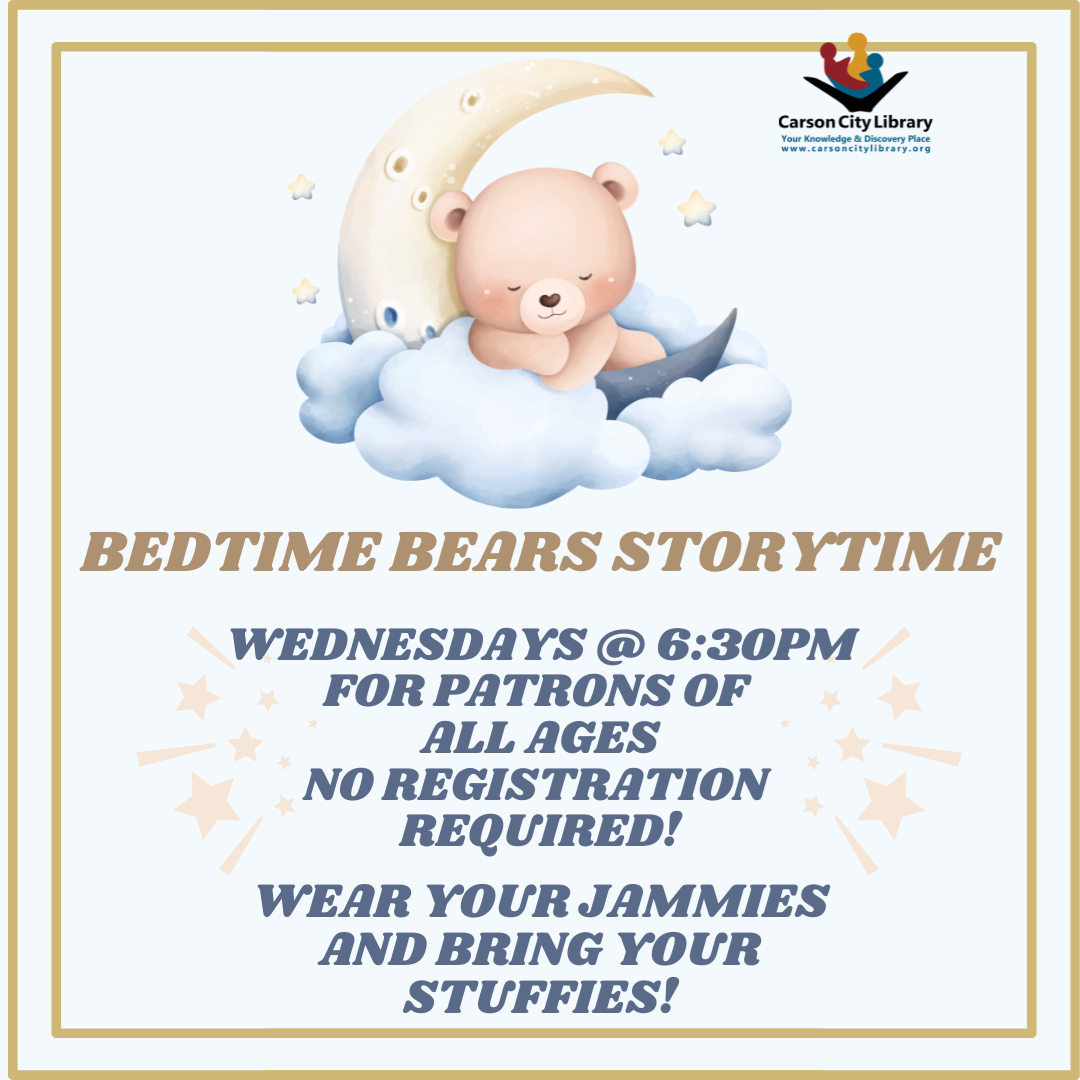 Wednesdays | 6:30 PMDigitorium | Carson City Library Get ready to wind down with stories, songs, and crafts at Bedtime Bears Storytime! Perfect for kids of all ages, this relaxing evening program helps little ones settle in for the night with calming activities and creative fun. No registration required—just drop in with your favorite stuffed animal or blanket and enjoy a cozy evening together.