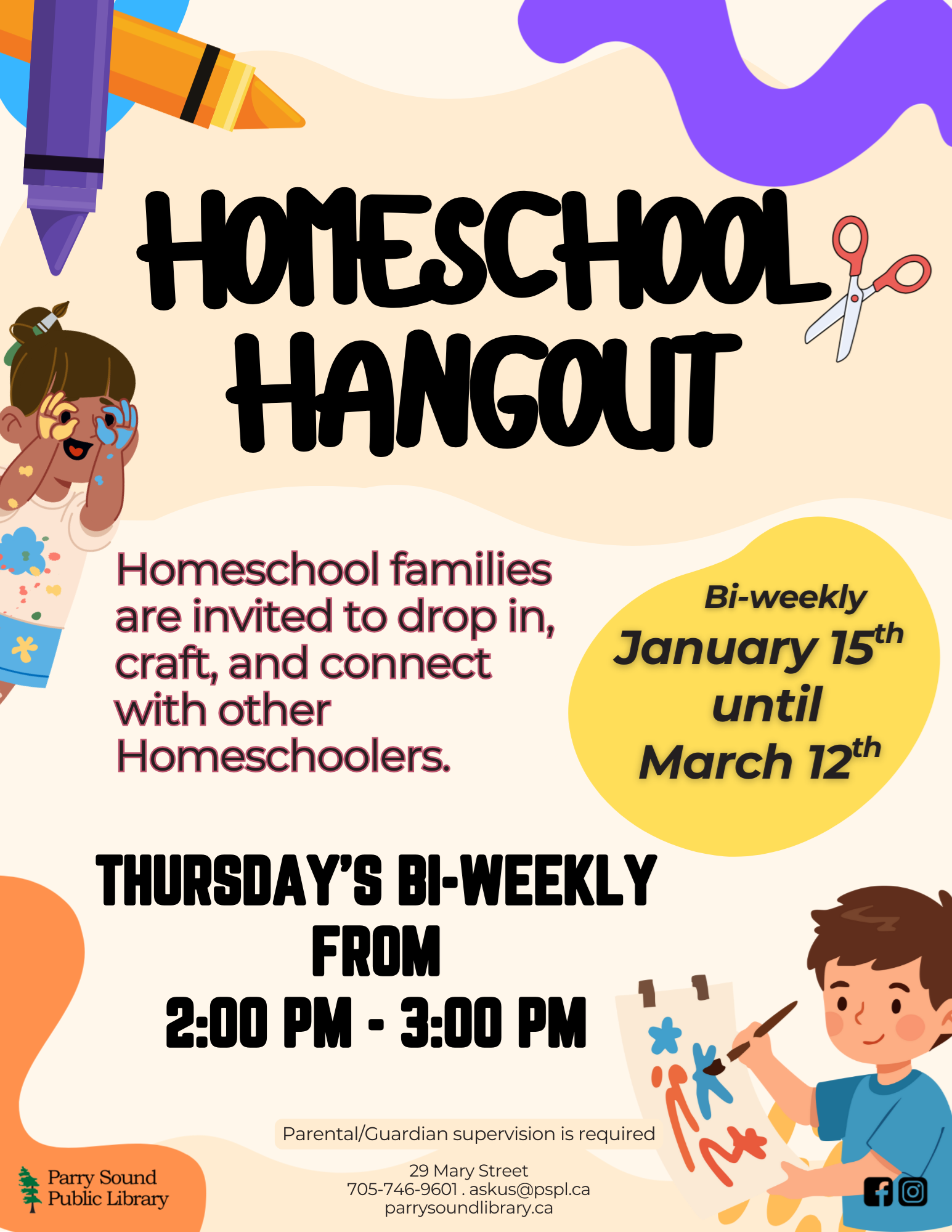 Homeschool HangoutBi-weekly Thursdays at 2 to 3 pm (Jan. 15th to Mar. 12th) Homeschool Families are invited to drop-in, craft and connect with other homeschoolers. Located in the library Children's section.