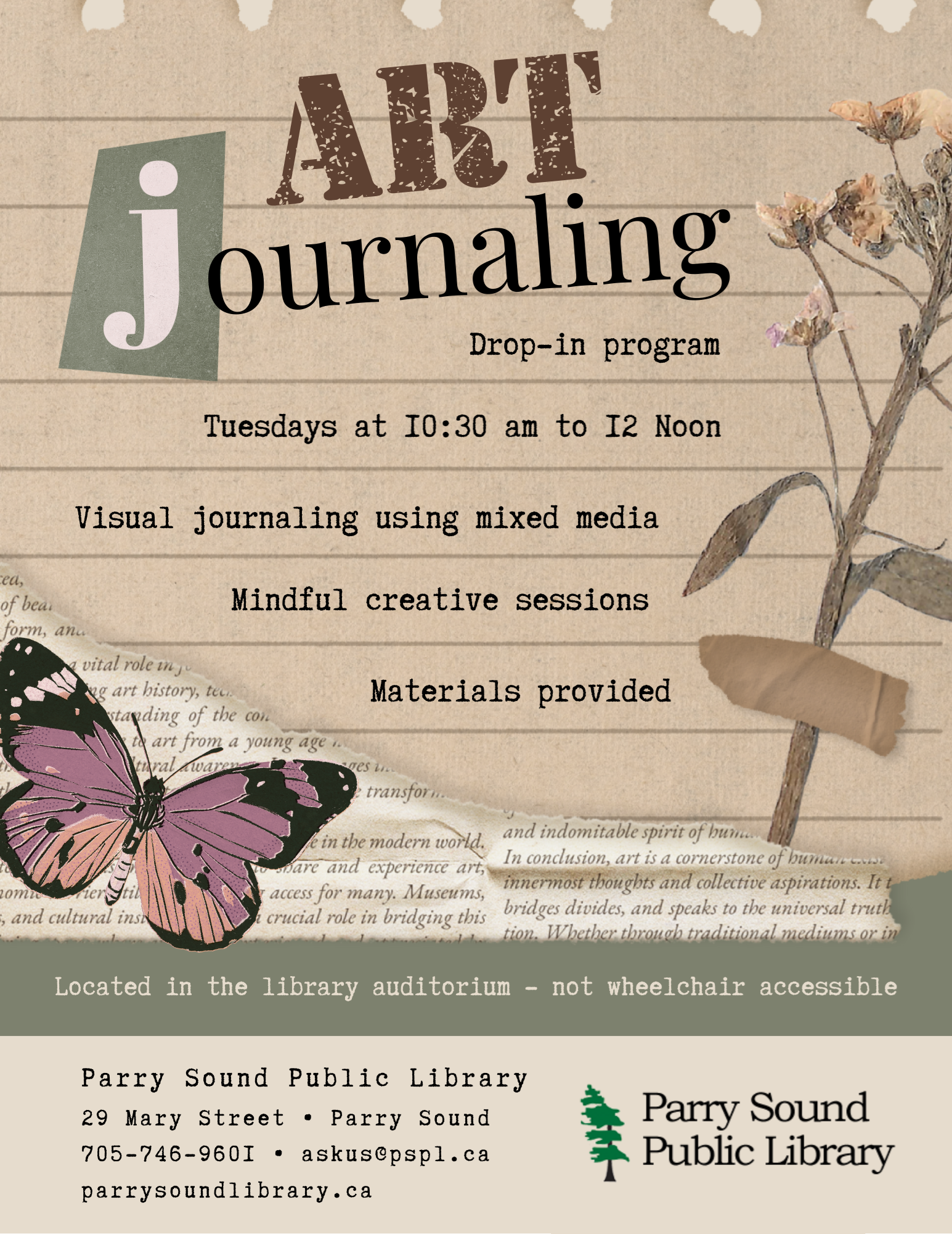 Art Journaling Tuesdays at 10:30 AM to 12 Noon (Jan. 13th to May 26th) Mindful creative sessions. Visual journaling using mixed media. Materials and journals provided Free drop-in program Located in the library auditorium*