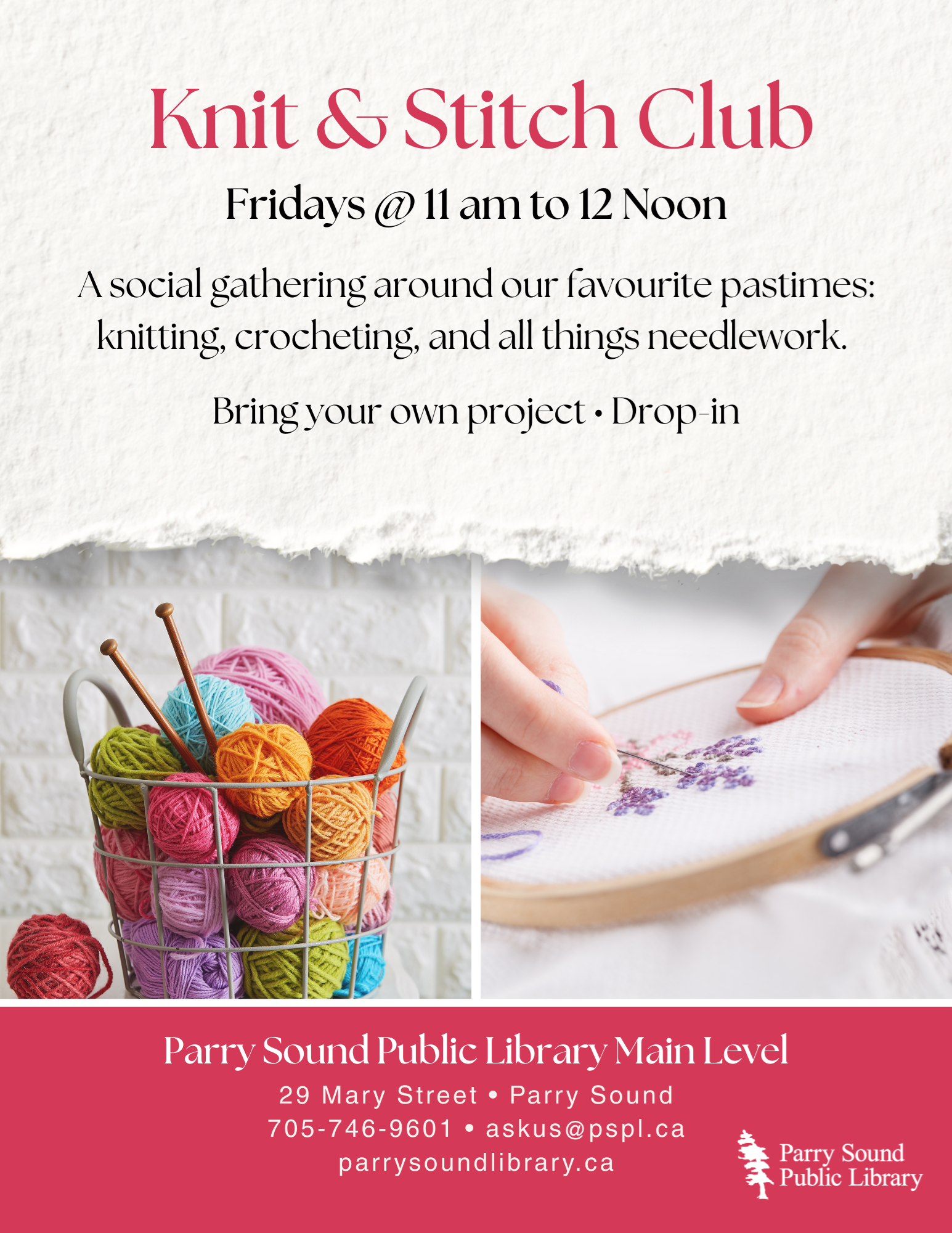 Knit & Stitch Club Fridays at 11 AM to 12 Noon (Jan. 16th to Mar. 6th) A social gathering around our favourite pastimes: knitting, crocheting, and all things needlework. Bring your own project Located on library main level