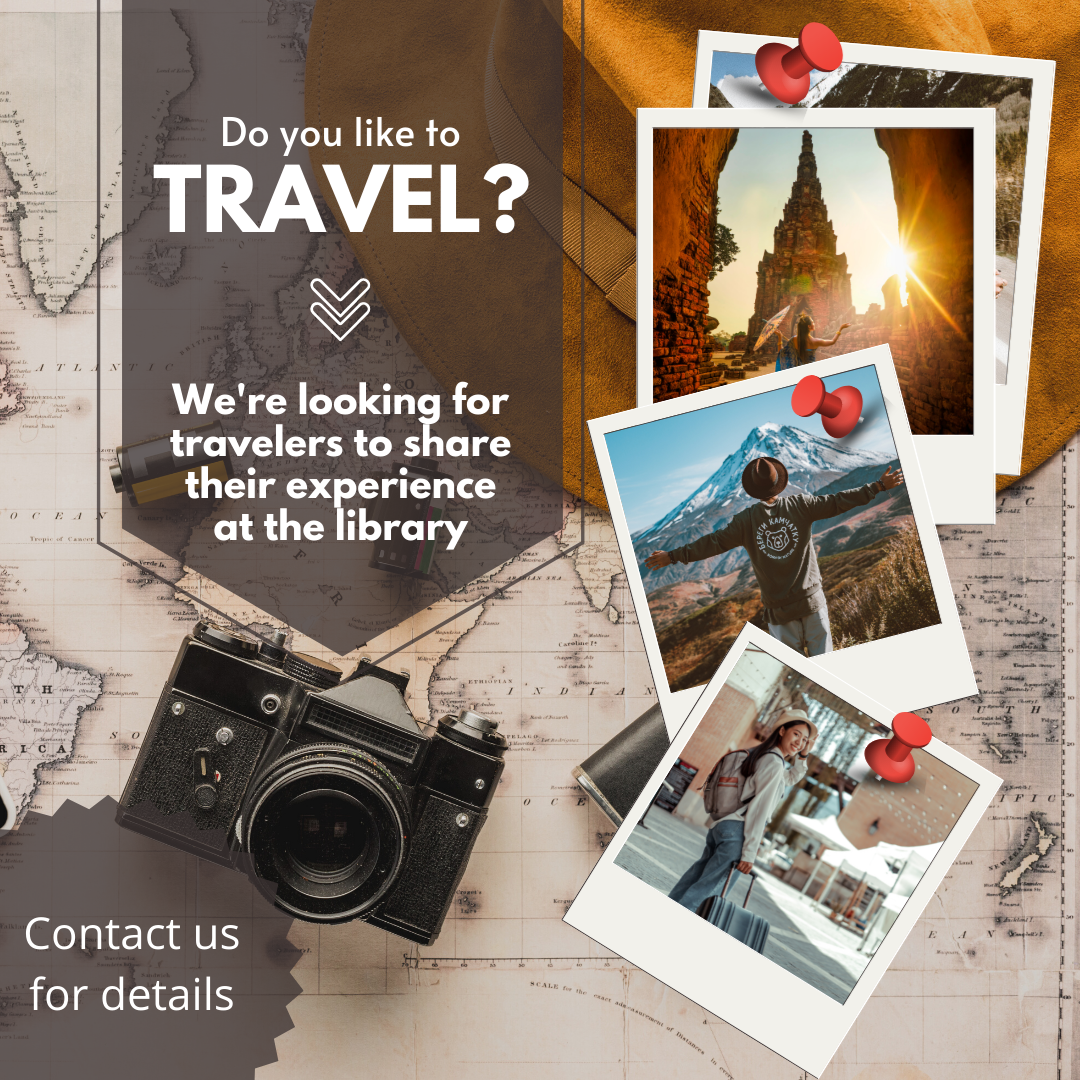 Travelogue We're looking for travelers to share their experience and photos at the library. Contact us if you're interested.