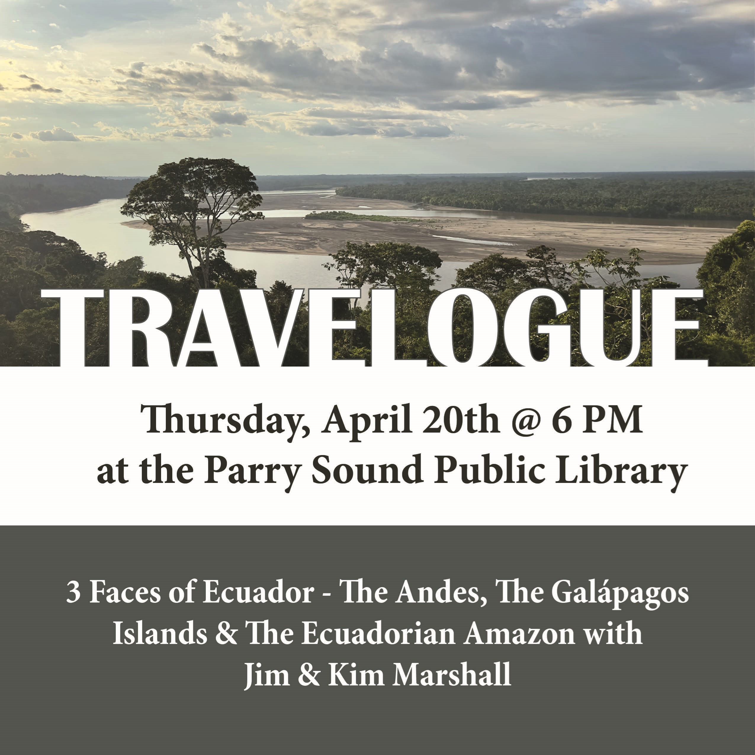 Travelogue Thurs, April 20th @ 6 PM 3 Faces of Ecuador - The Andes, The Galápagos Islands & The Ecuadorian Amazon Feed your wanderlust! Join us for a travel presentation by Jim and Kim Marshall on their exciting adventure through Ecuador with photos and stories.