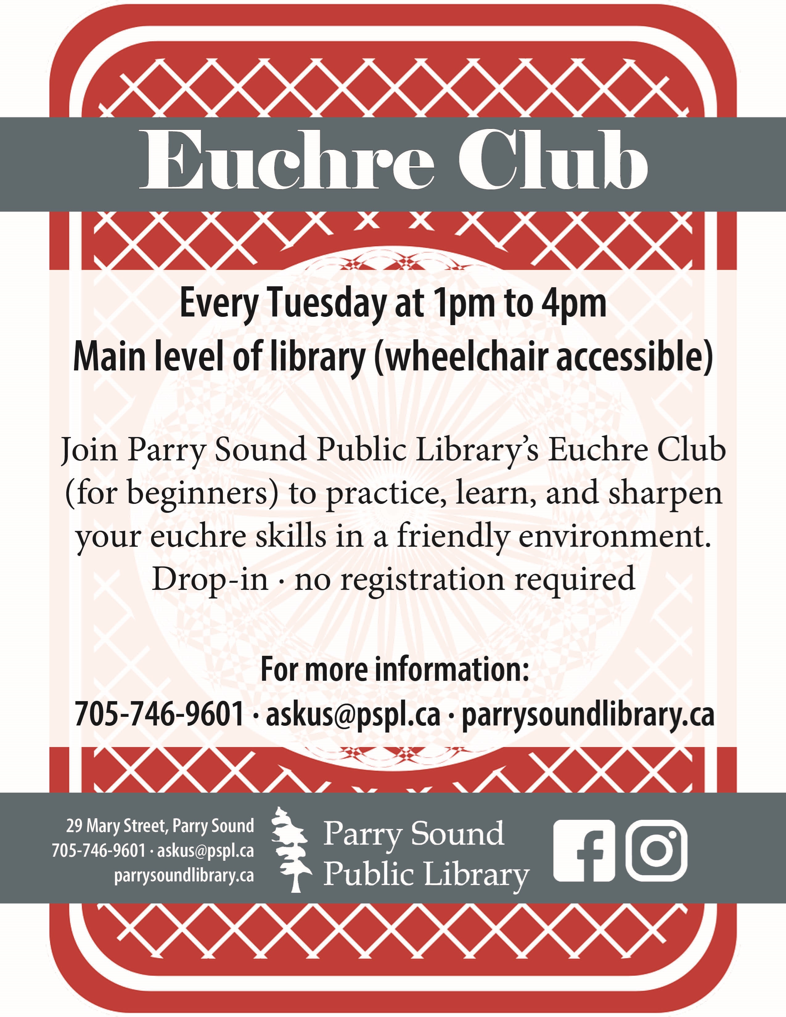 Euchre Club (for beginners) Tuesdays at 1 PM to 4 PM Join PSPL's Euchre Club to practice, learn, and sharpen your euchre skills in a friendly environment. Drop-in, no registration required. Located on the main level of the library (wheelchair accessible)
