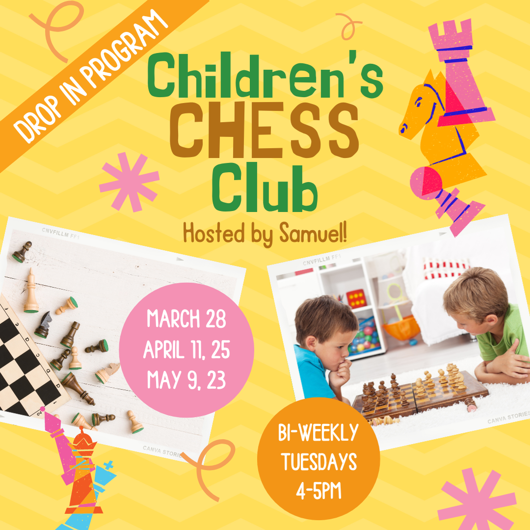 Children's Chess Club Hosted by Samuel! Join us in the children's department of Parry Sound Public Library for a bi-weekly chess club! The club will run from 4-5pm On the following dates: Apr. 11 & 25, May 9 & 23