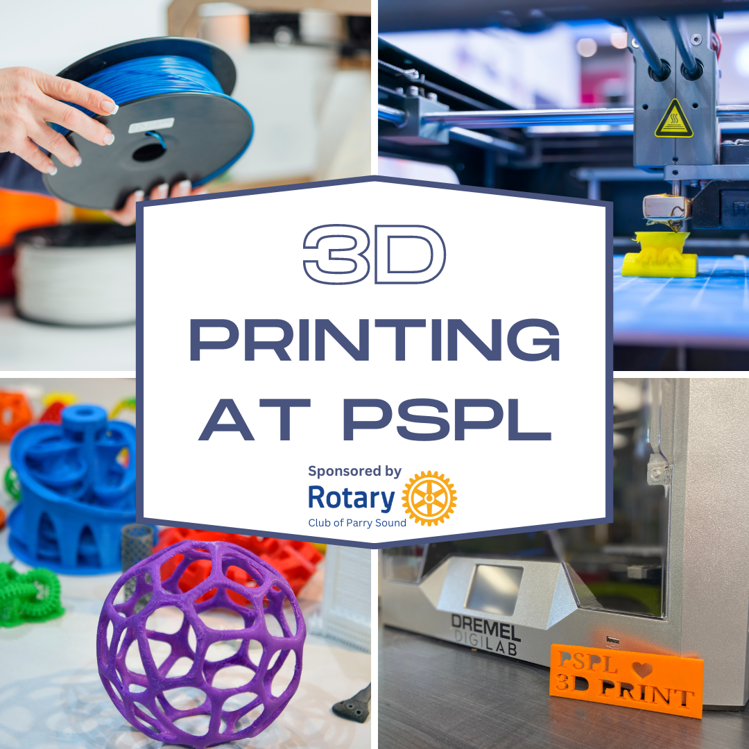 Ask us about our new 3D printer! Design and print your own creations. Fees apply. A special thank you to Rotary Club of Parry Sound!