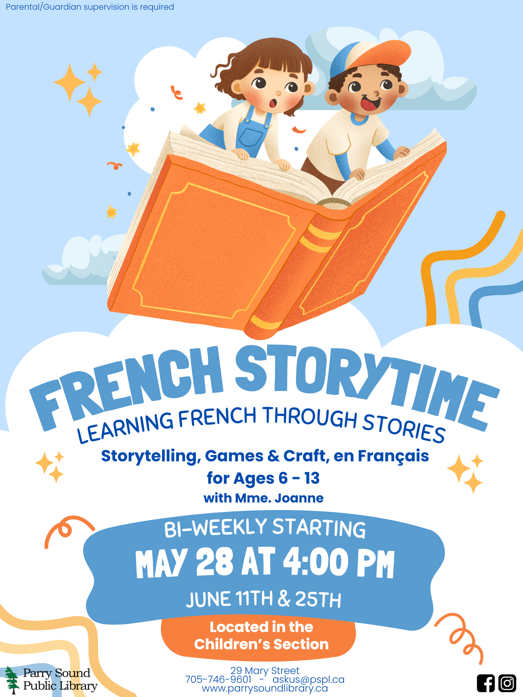 French Storytime Wed. May 28, June 11 & 25 4 to 5 pm Learning French through stories with Mme. Joanne. Storytelling, Games & Craft, en Français for ages 6 - 13. Bi-weekly drop-in afterschool program. Located in the library children's section.