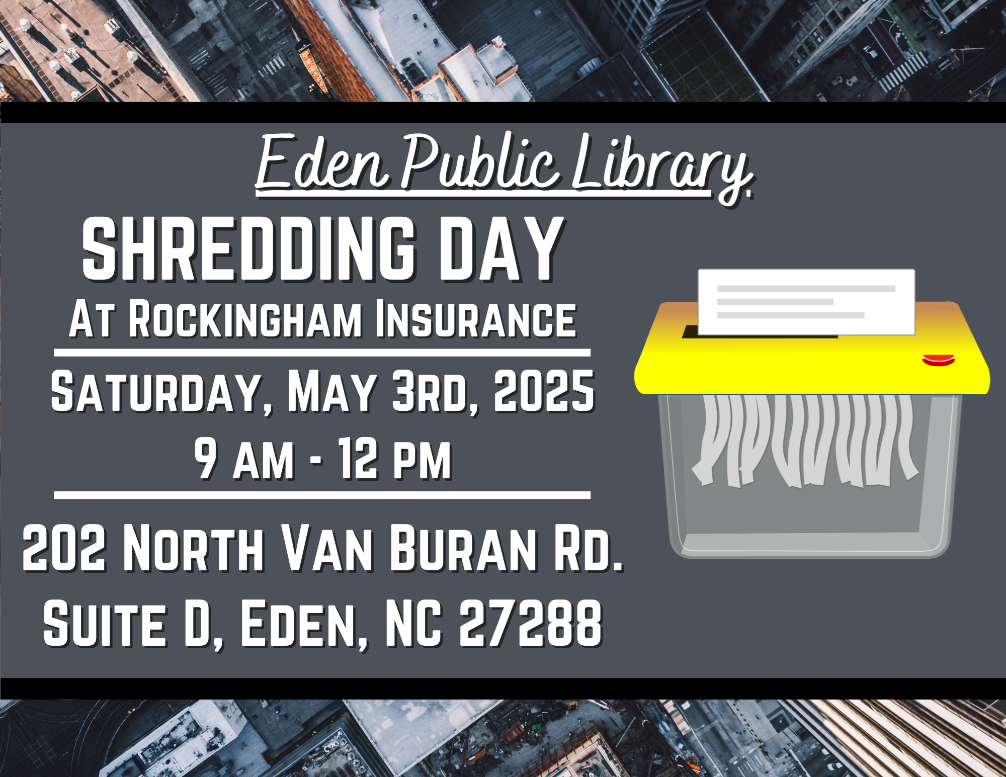 Join us in the Rockingham Insurance parking lot on Saturday May 3rd from 9 a.m. until 12 p.m. for the next Friends of the Eden Library Shredding Day.