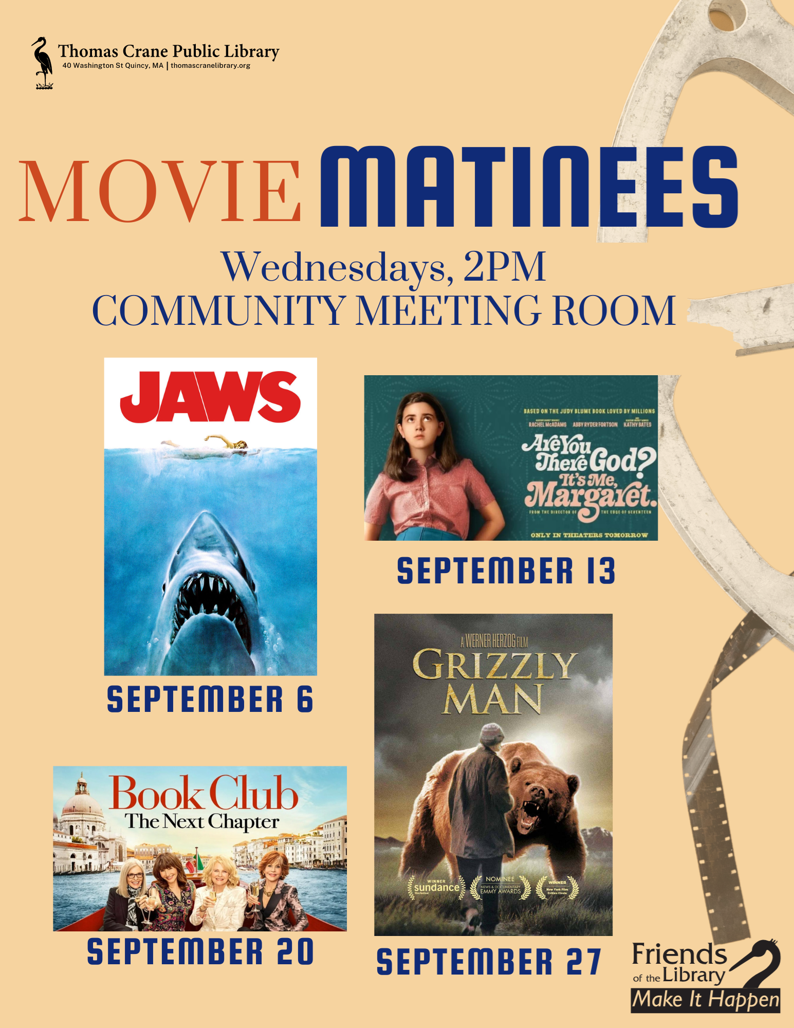 Monthly Events Ages 1-5 years Thursday, September 7 | 6:30 PM Main Library Ages 0-5 years Tuesday, September 12 | 6:30 PM North Quincy Library Ages 6-8 years Wednesday, September 13 | 1 - 2 PM Adams Shore Library Elliot and his owner Michelle are volunteers trained by Dog B.O.N.E.S. therapy dogs of Massachusetts. 10 minute timeslots with Elliot will be assigned on a first come first served basis. Wollaston Library North Quincy Library Adams Shore Library Main Library Ages 0-7 years Monday, September 18 | 6:15 PM Adams Shore Library Ages 10-15 years Tuesday, September 19 | 7 PM Main Library Registration Required Grades 3-5 Wednesday, September 20 | 3PM Main Library Grades 4-6 Wednesday, September 20 | 7 PM Wollaston Library Grades 5-8 Wednesday, September 27 | 1 PM Main Library