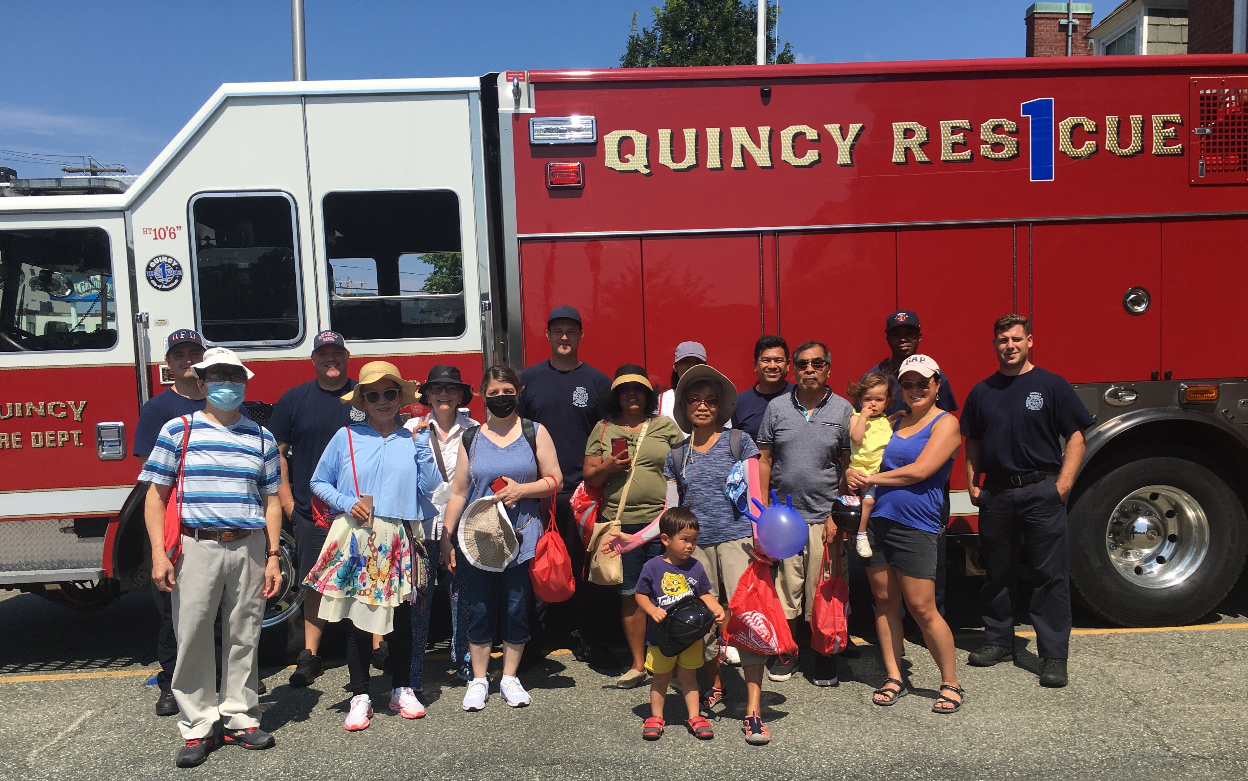 Walk & Talk is part of English Talk Time, the library's ESOL program for adults interested in practicing their English Conversation skills. Meeting every Thursday from 10:00 a.m. to 11:30 AM, participants of the Walk & Talk program enjoy walking around Quincy Center, having casual conversation and learning about the area. Participants often visit local places of interest like the QArts Gallery, the Dorothy Quincy Homestead and nearby parks. Special thanks to the firefighters of Engine 1 Headquarters for the fun and informative tour our group enjoyed this summer! Whether you are interested in practicing your English or are someone who enjoys meeting people from other cultures, all are welcome to join our Thursday walks! Children are welcome, as well, but must be accompanied and supervised by a caretaker at all times. The walks are always posted on the library's public online calendar. Check the calendar of events to find out if a walk is happening on an upcoming Thursday. We hope to walk... and talk... with you soon!