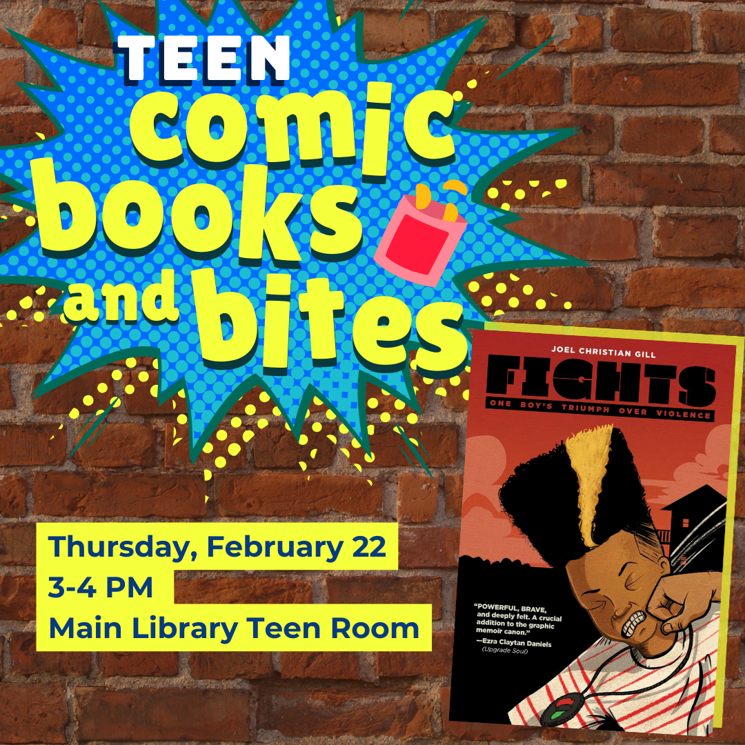 3 - 4 PM Main Library, Teen Space Each month we'll read a graphic novel we vote on, and munch on some international snacks while we discuss the book! For our February meeting, we'll be reading Fights: One Boy's Triumph Over Violence by Joel Christian Gill, available for pick up at the Teen desk or through Hoopla! This month's international snacks are from Scandinavia! No Registration Required For teens in grades 8 - 12 only