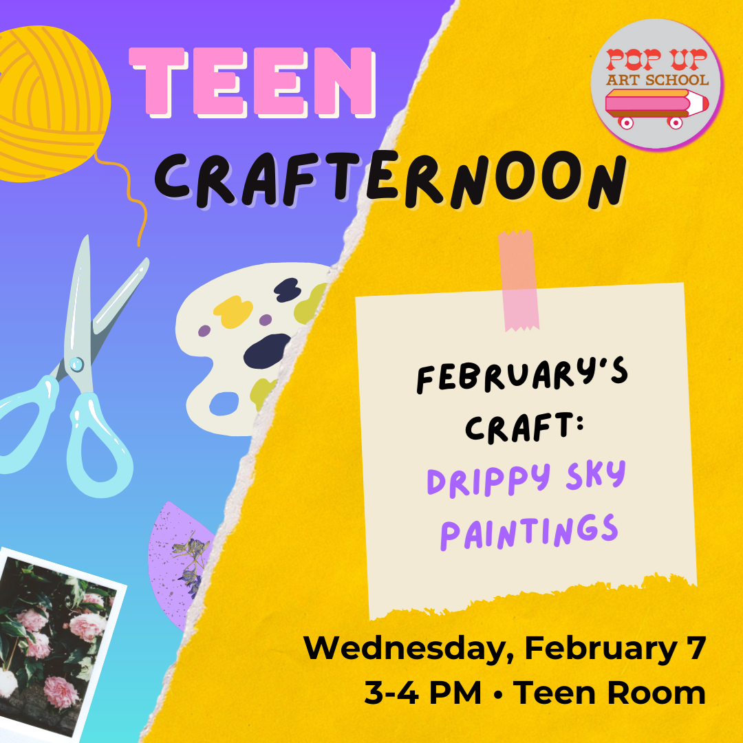 Wednesday, February 7 3 - 4 PM Main Library Stop by our monthly crafternoon to make something and enjoy snacks! This month's craft is Drippy Sky PaintingsI No Registration Required For teens in grades 8 - 12 only