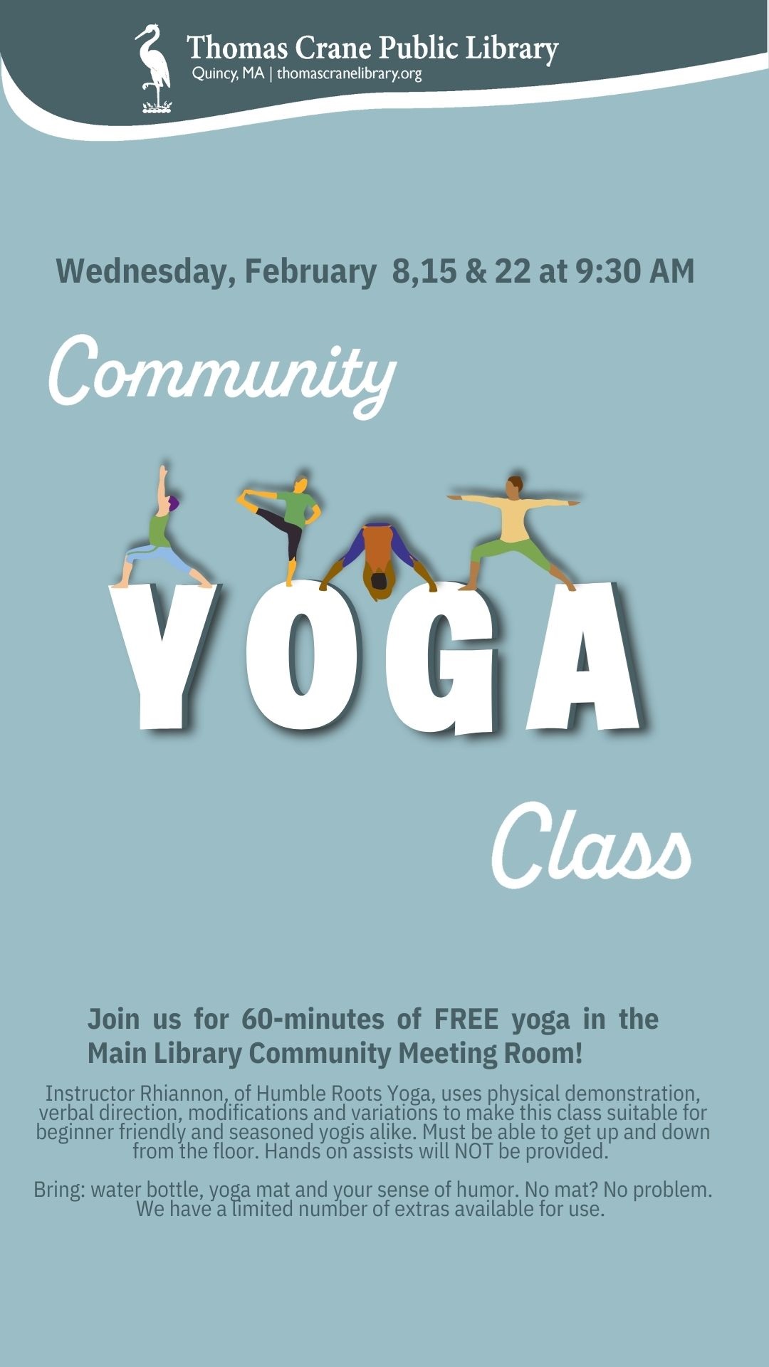 February 8, 15 & 22 9:30 - 10:30 AM Community Meeting Room - Main Library Instructor Rhiannon, of Humble Roots Yoga, uses physical demonstration, verbal instruction, modifications and variations to create a class suitable for beginners and seasoned yogis alike. Must be able to get up and down from the floor. Hands on assistance will NOT be provided. Bring: water bottle, yoga mat, and your sense of humor. No Mat? No problem. We have a limited number of extras available for use.