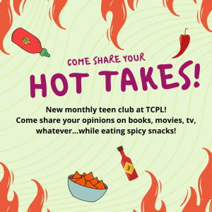 Monday, April 14 3 - 4 PM Main Library For April's meeting, you are encouraged to make a PowerPoint or Google Slides slideshow of your hot takes if you wish! No Registration Required For teens in grades 8 - 12 only