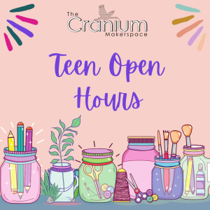 Tuesday, April 1 (Monthly) Drop-In: 2:30 - 4 PM The Cranium, Main Library Some equipment requires booking in advance. Please have a parent or guardian sign our waiver (available in the Teen Room) before attending. Questions? Email quref@ocln.org with the subject line "Teen Open Hours"! For teens in grades 8 - 12 only