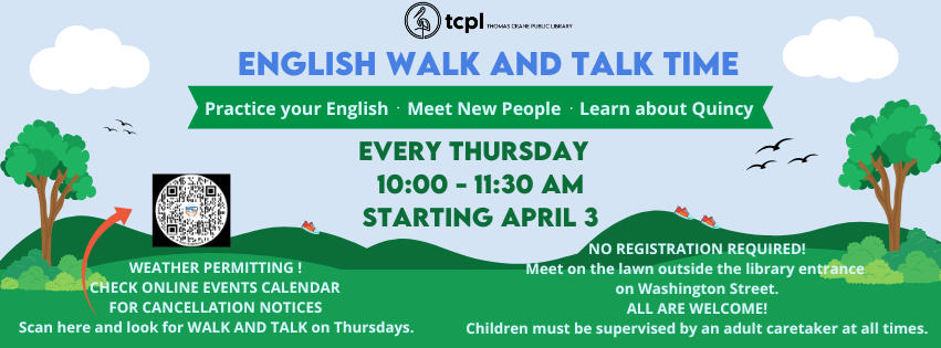 We are very excited to announce that our outdoor walking program for Adult English Language Learners will start again on Thursday, April 3 from 10 - 11:30 AM! Walk and Talk is a great way to meet new people, practice your English and learn about Quincy Center. - Meet in front of the library (on Washington Street) at 10 AM.