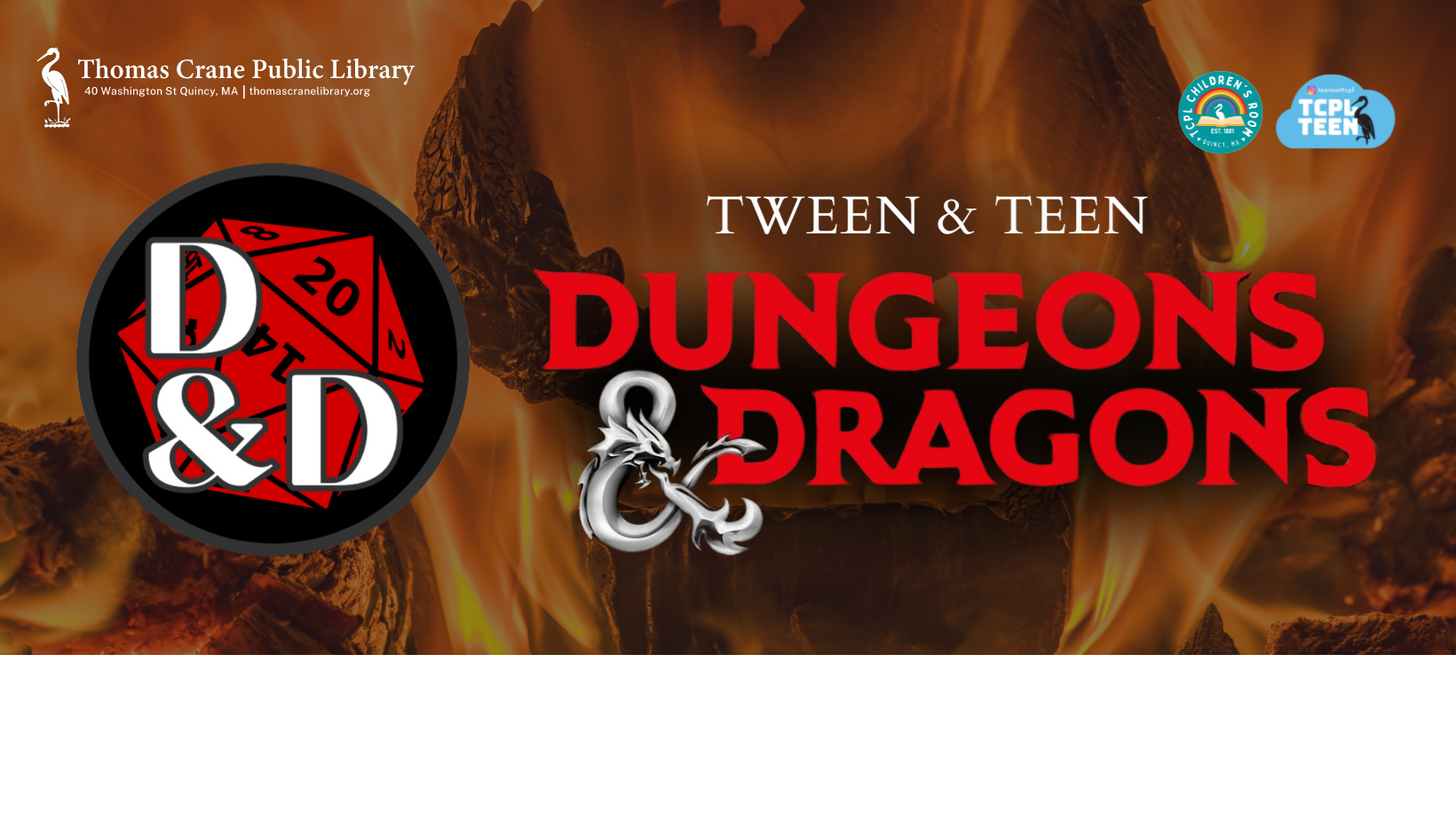 7 - 8:30 PM Main Library, Children's Room New and experienced players are invited to join us for this introduction to D&D 5th edition game play. Take on the role of a fantasy hero in this Dungeons & Dragons game. We will meet for an hour and a half for to play this story. Limited to Quincy Residents only. There is no Wait List. For ages 10-15 years only