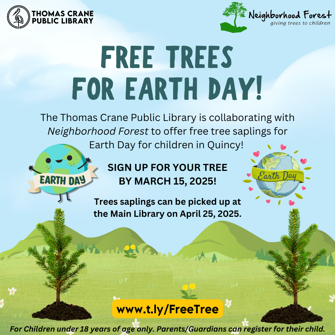 The Children's Department is collaborating with Neighborhood Forest to offer free tree saplings for Earth Day for children in Quincy! Tree saplings can be picked up at the library on April 25, 2025. Parent FAQs To find out more information about what kind of tree you may receive, how to plant and care for it, and more, please click on the link here. Check out the tree planting guide!
