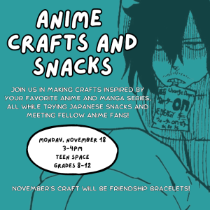 Thursday, Nov 14 3:30 - 4:30 PM Main Library No Registration Required For teens in grades 8 - 12 only