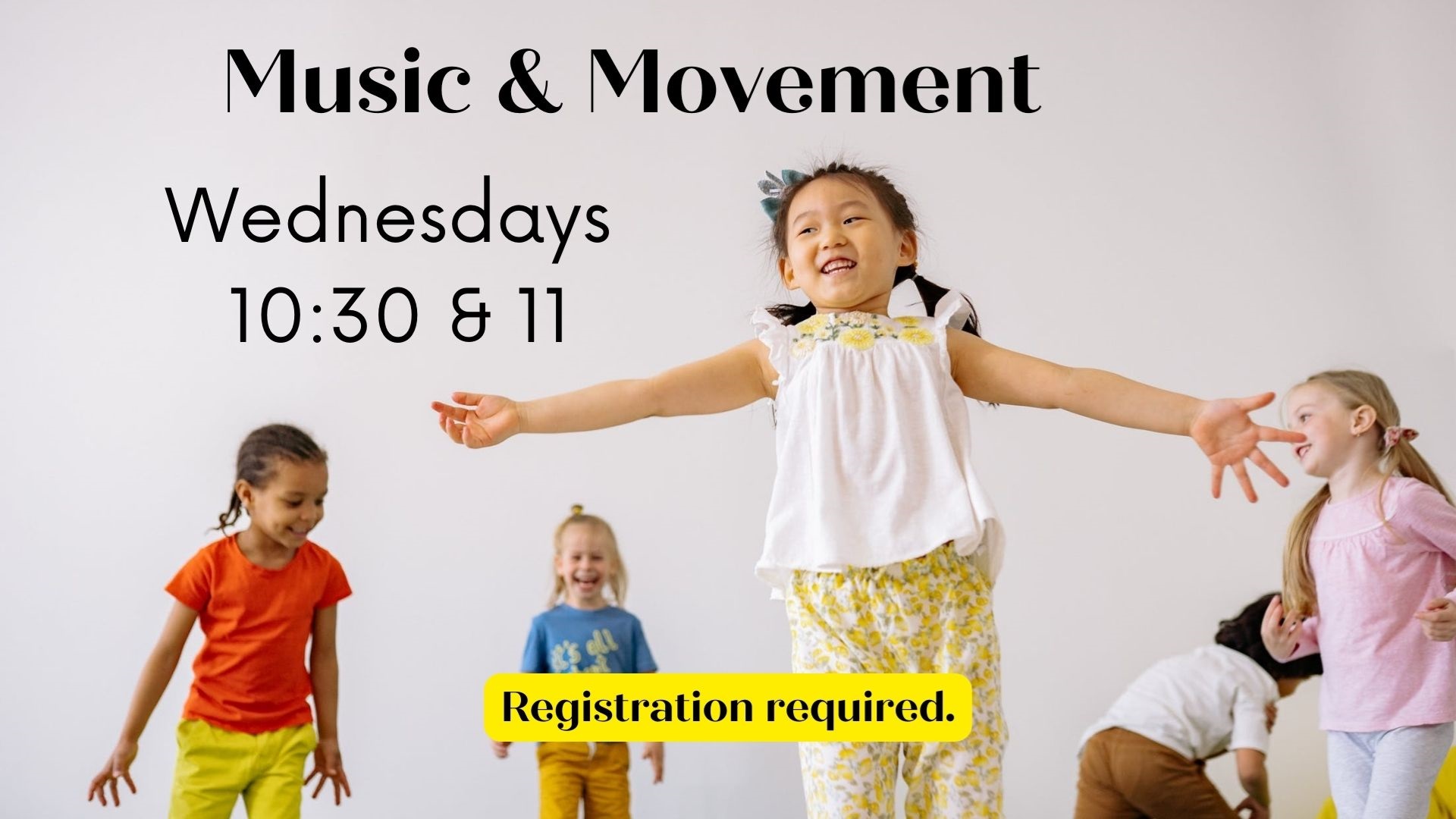 Music & Movement with Jessica Wednesdays 10:30-11:00am & 11:00-11:30 All ages Meeting Room Ages 0-5 are welcome to join Jessica for 30 minutes of participatory songs and fingerplays that support early literacy and get your body moving. For the safety of all participants, registration is required and will be limited. Please sign up for each week you are interested in attending. To register for Wednesday, May 4 10:30, click here To register for Wednesday, May 4 11:00, click here To register for Wednesday, May 11 10:30, click here To register for Wednesday, May 11 11:00, click here To register for Wednesday, May 25 10:30, click here To register for Wednesday, May 25 11:00, click here