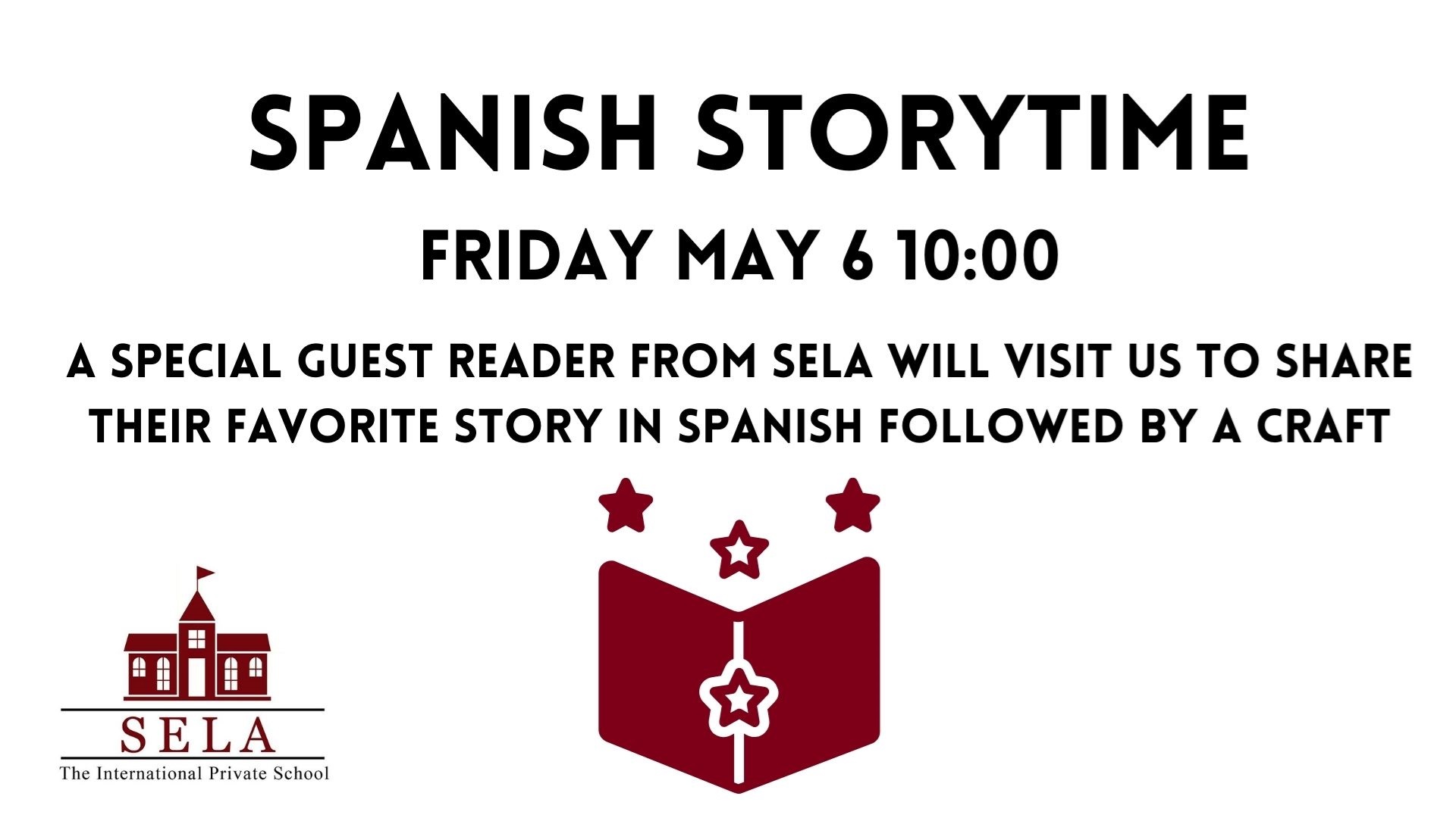 Spanish Storytime Friday May 6 10:00am All ages Meeting Room Spanish Storytime hosted by SELA: The International Private School in Hingham, MA. Registration is required.
