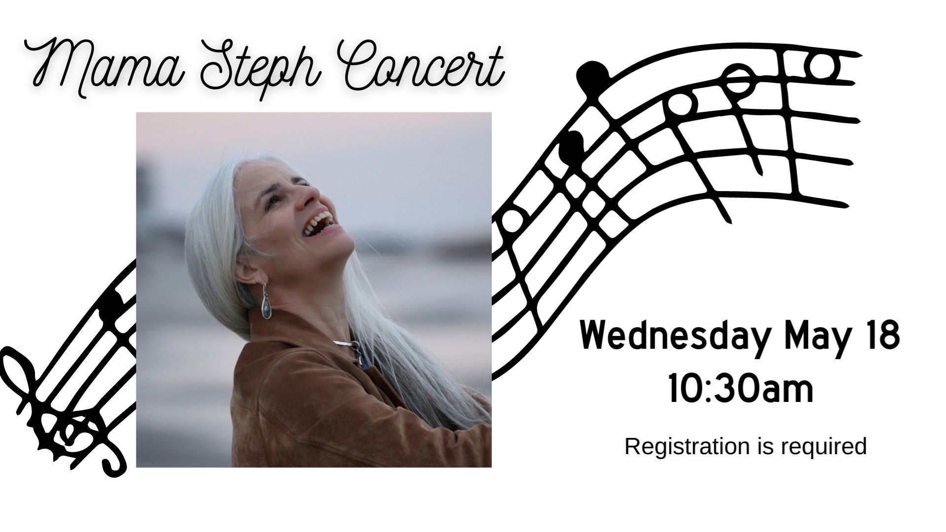 Mama Steph Concert Wednesday May 18 10:30am Ages 0-5 Meeting Room Mama Steph is back to sing along with ages 0-5 and their caregivers.