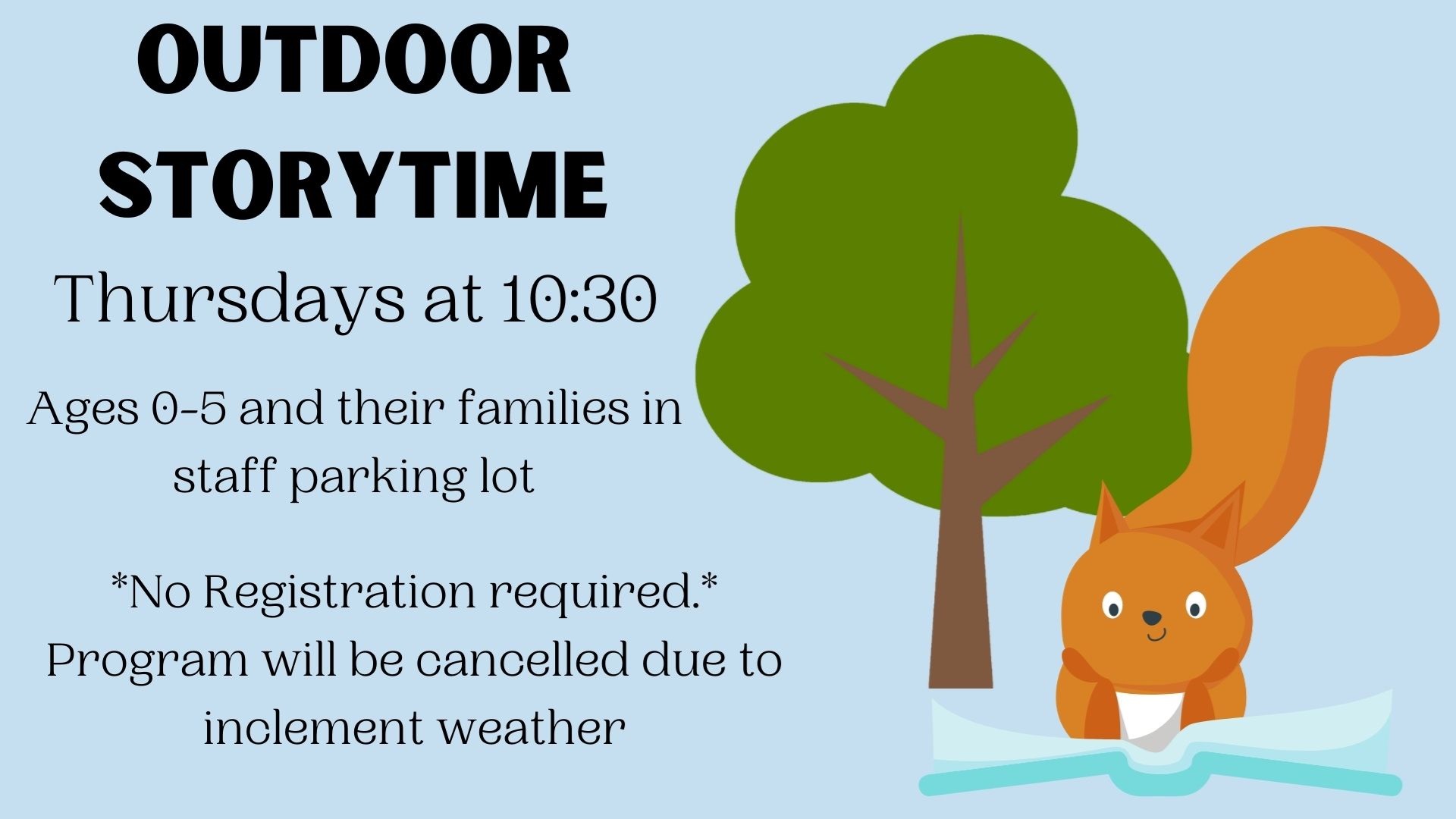 Outdoor Storytime Thursdays 10:30-11:00am All Ages Staff Parking Lot No registration required. In the case of inclement weather, the program will be cancelled. Please bring a chair or blanket. *NO storytime on May 5*