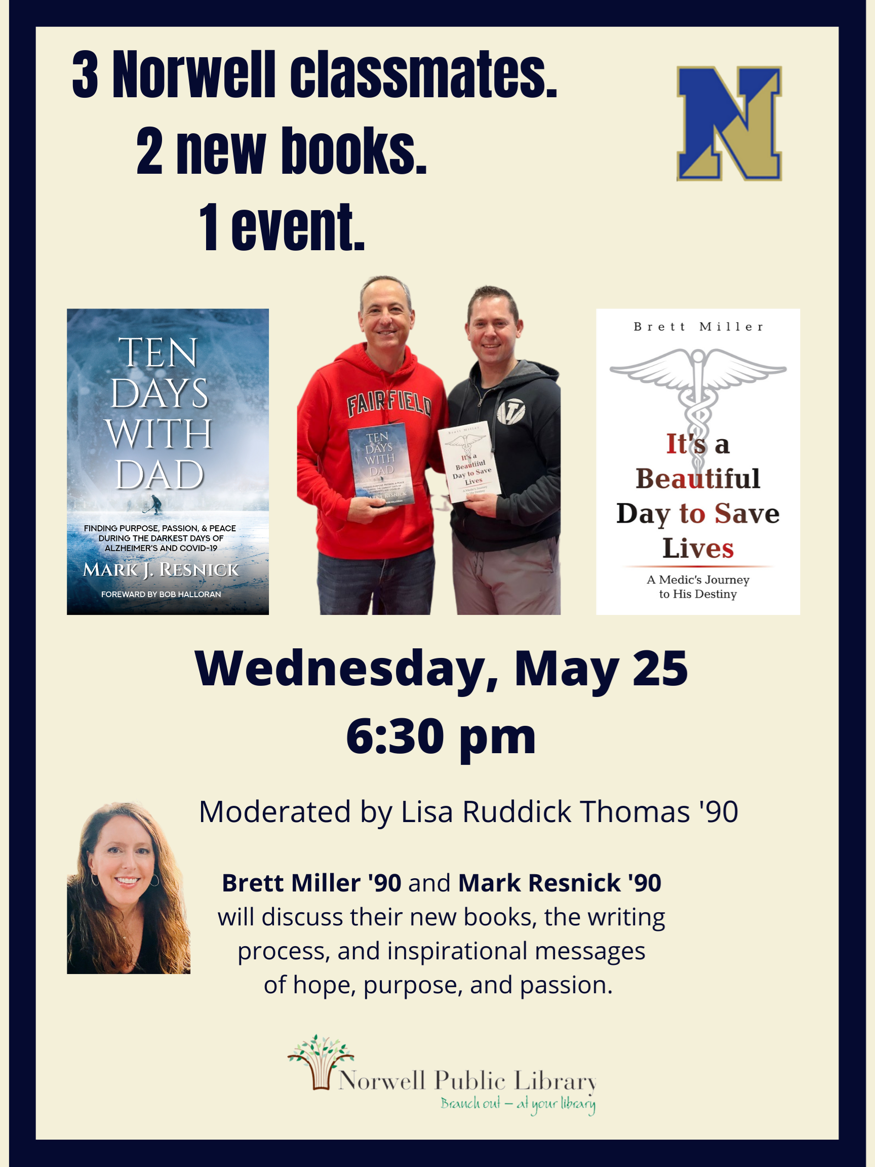 Author Talk with Mark Resnick and Brett Miller Wednesday, May 25 6:30pm - 7:30pm Meeting Room Join us for an evening author talk and book signing featuring local authors Brett Miller and Mark Resnick moderated by Lisa Ruddick Thomas. Brett and Mark will be discussing their two new books Ten Days With My Dad and It's a Beautiful Day to Save Lives, their writing processes, and inspirational messages.