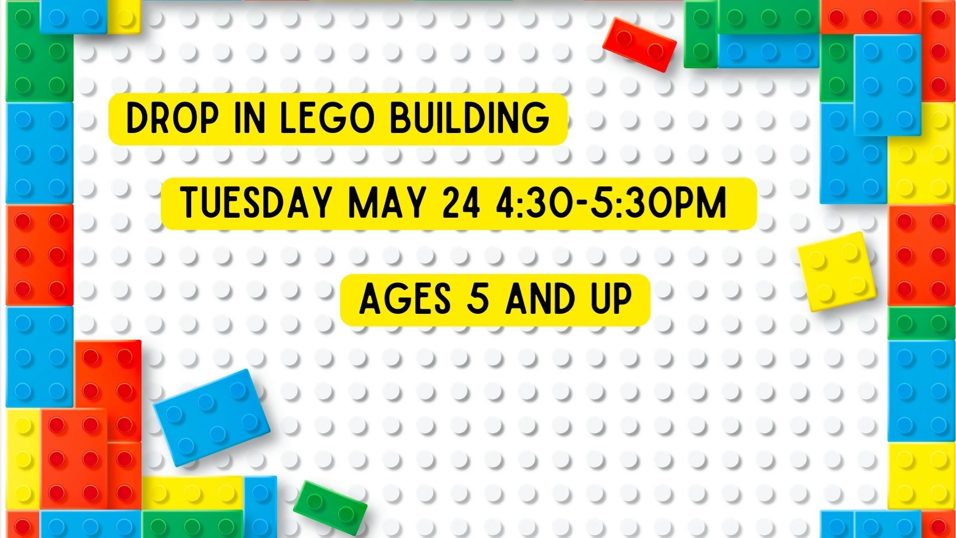Drop in Lego Building Tuesday May 24 4:30-5:30pm Ages 5 and up Children's Studio Drop in for some Lego building challenges with the library Legos. No registration required.