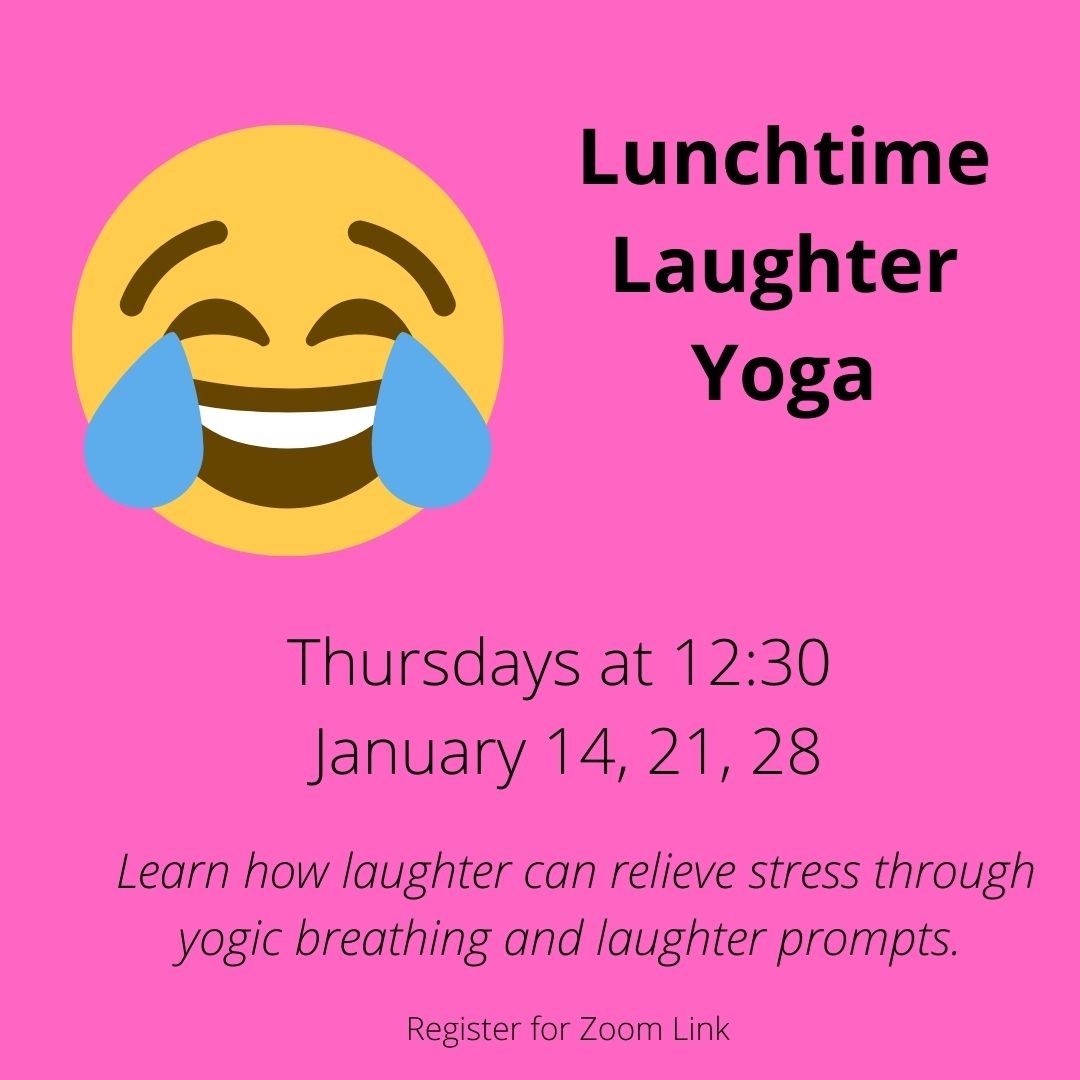 Lunchtime Laughter Yoga Thursdays at 12:30 PM January 14 - January 28 Online Participation with Zoom Need a stress break? Join certified laughter yoga leader Jessica Phillips through a half an hour of laughter prompts and yogic breathing for stress relief. No experience necessary. Specifically geared towards adults but it is open to all ages who can laugh. For more information about laughter yoga, visit https://laughteryoga.org/