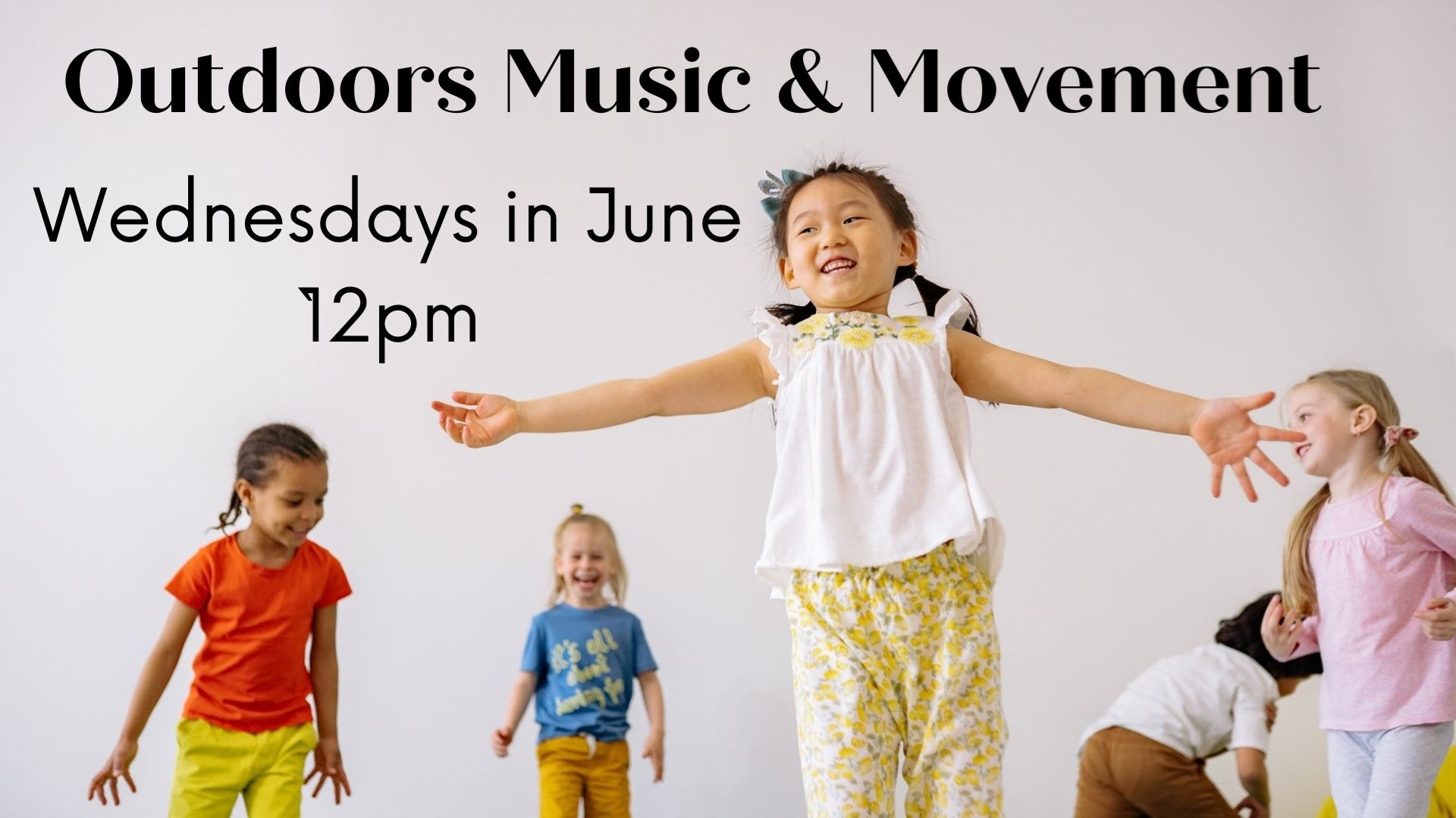 Outdoors Music & Movement with Jessica Wednesdays 12:00-12:30pm All ages Staff Parking Lot Ages 0-5 are welcome to join Jessica for 30 minutes of participatory songs and fingerplays that support early literacy and get your body moving. In the case of inclement weather, the program will be cancelled. Please bring a chair or blanket.