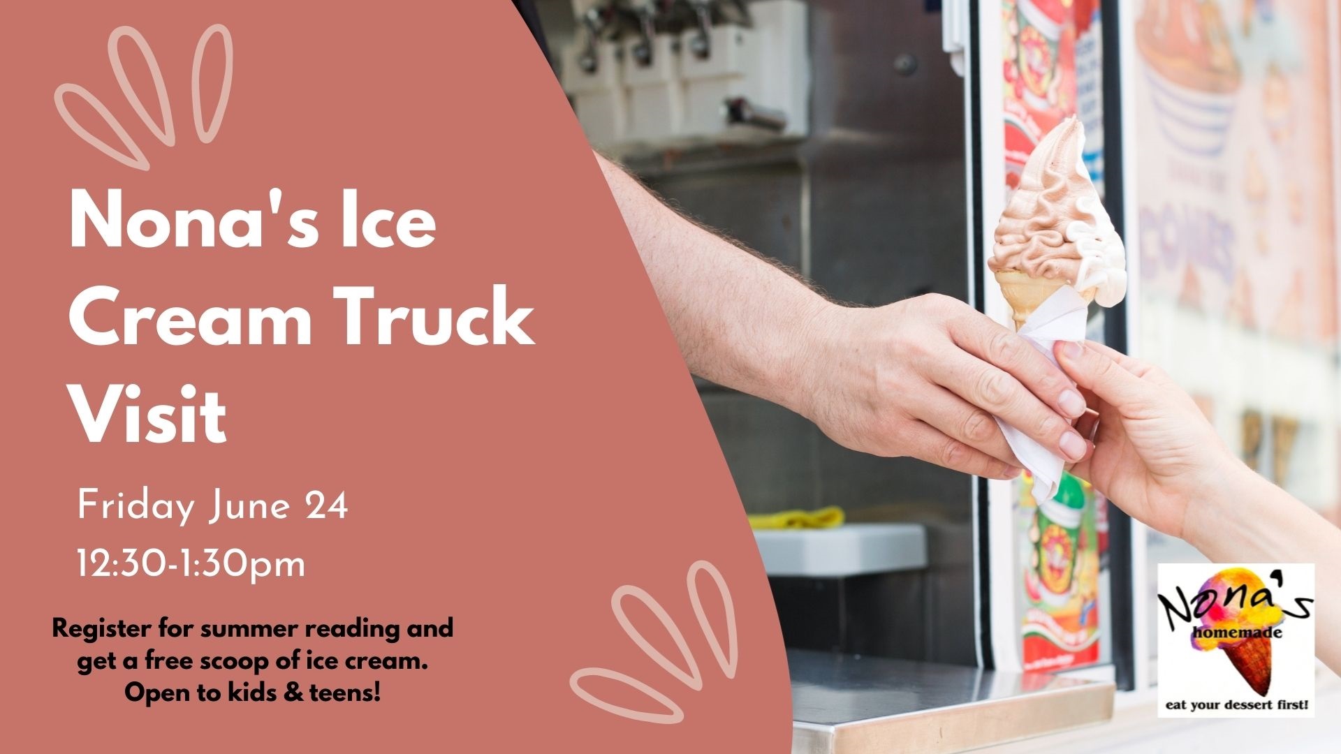 Nona's Ice Cream Truck Visit Friday, June 24 12:30 - 1:30pm Staff Parking Lot Kids & Teens can register for summer reading and get a free ice cream cone while supplies last.