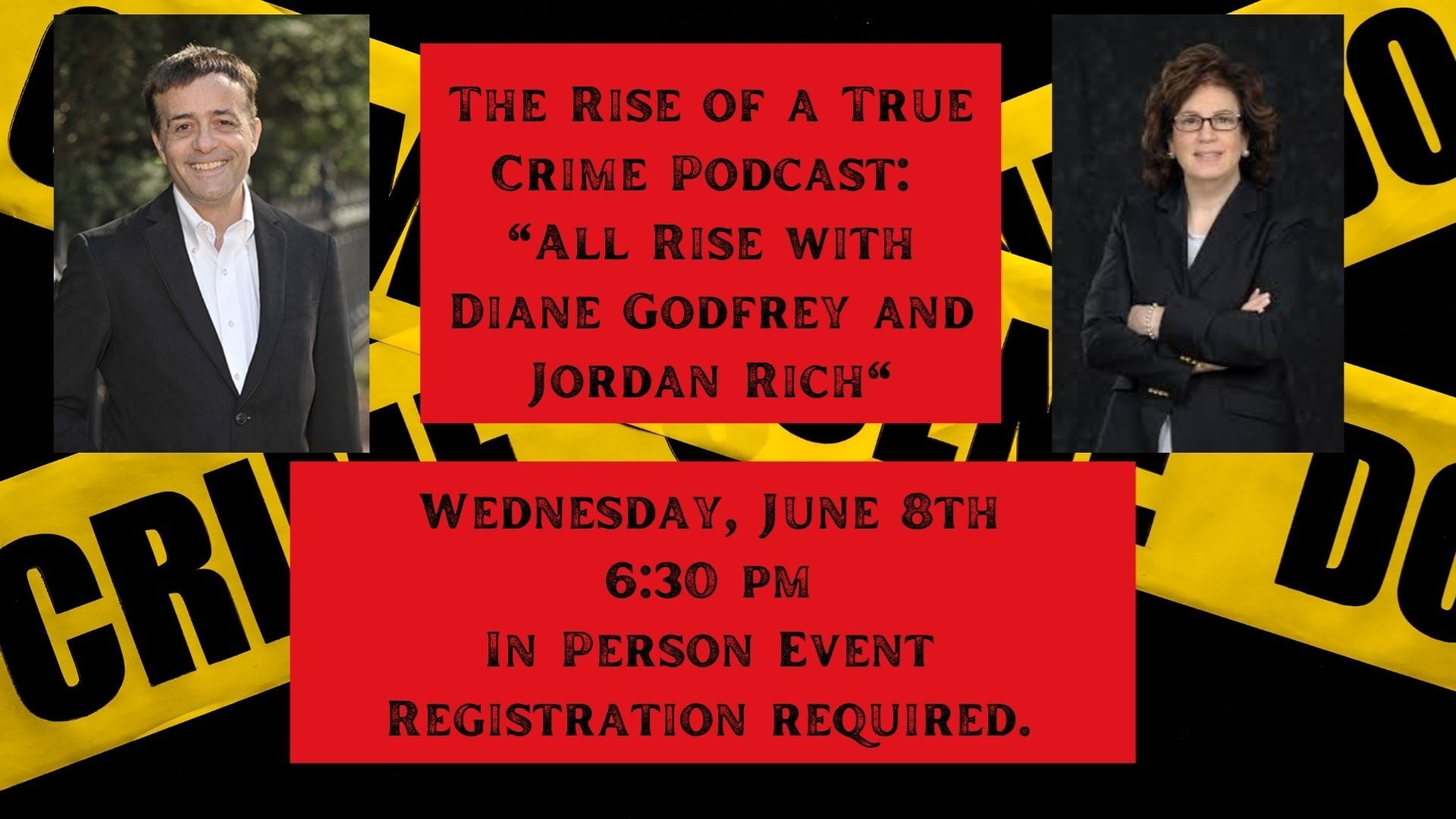 The Rise of a True Crime Podcast “All Rise with Diane Godfrey and Jordan Rich” Wednesday, June 8 6:30pm - 7:30pm Meeting Room The library is hosting an exciting evening event with podcasters Diane Godfrey and Jordan Rich from the Massachusetts-based true-crime podcast, All Rise. Jordan Rich explains what a podcast is, how a podcast is made, and how he and Diane Godfrey came together as cohosts. Diane Godfrey will discuss her 30-plus year career as a court reporter in the courts of the Commonwealth of Massachusetts, along with her experiences as a podcast cohost.