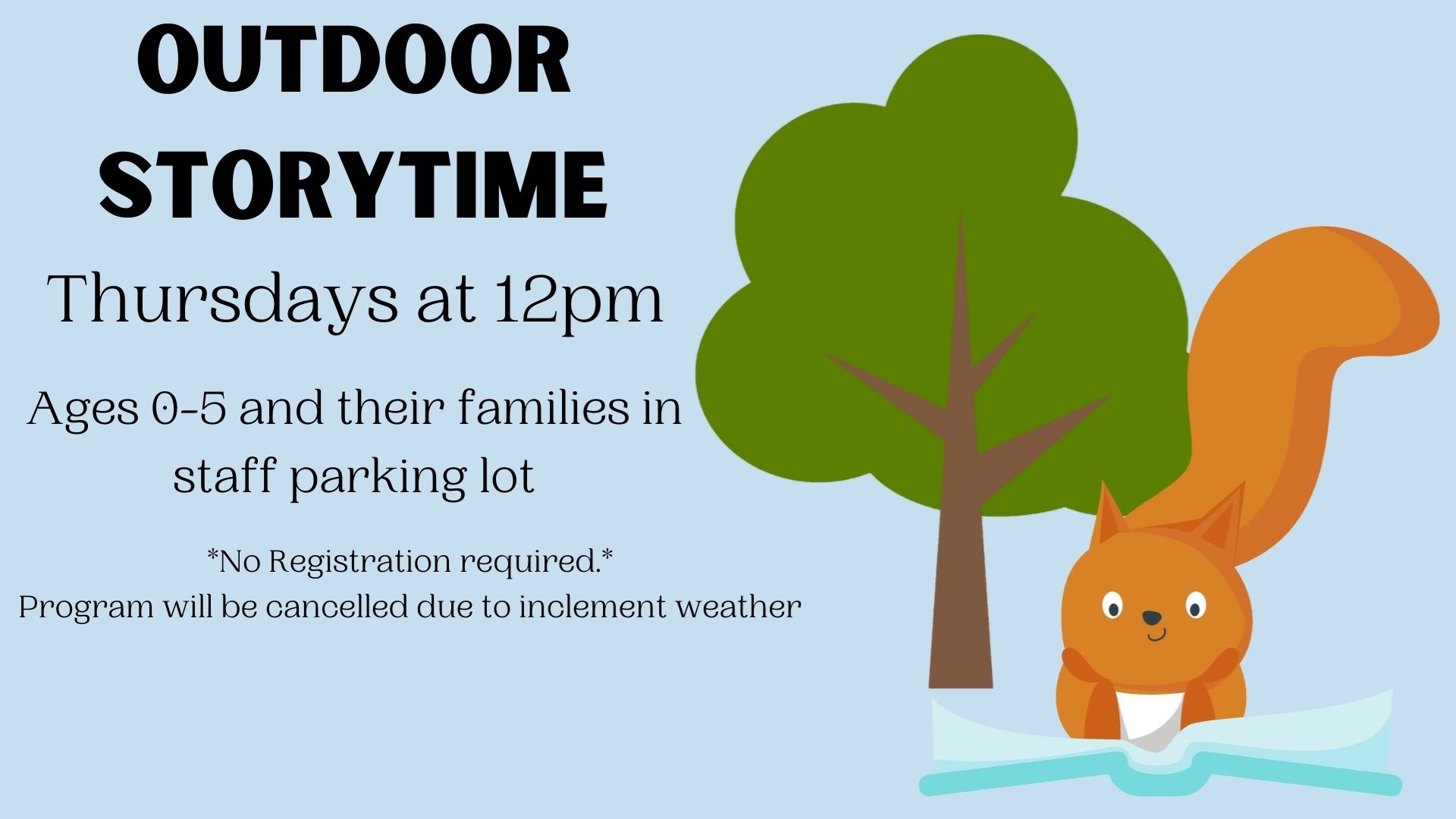 Outdoor Storytime Thursdays 12:00-12:30pm All Ages Staff Parking Lot No registration required. In the case of inclement weather, the program will be cancelled. Please bring a chair or blanket.