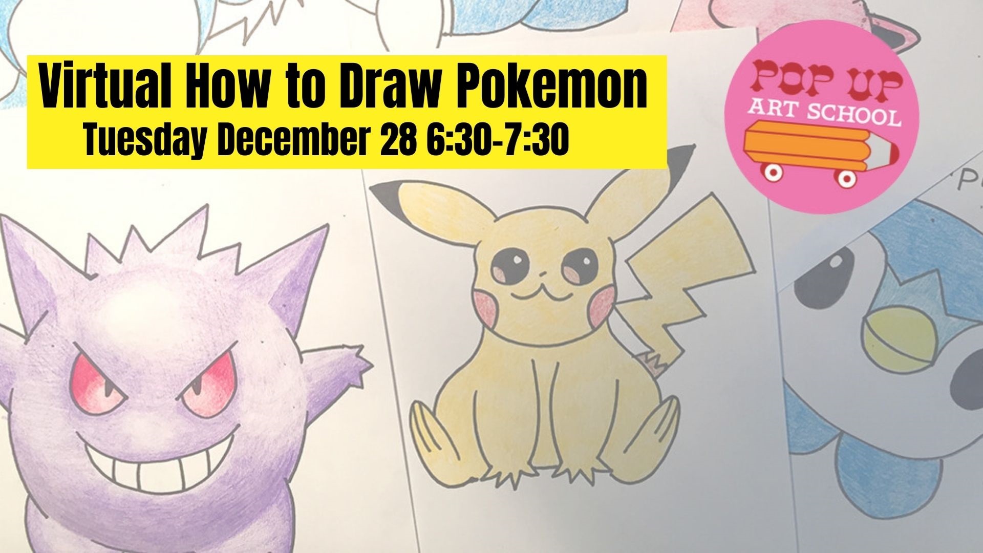 Pop Up Art School Presents: How to Draw Pokemon Tuesday December 28 6:30-7:30 Virtual on Zoom All you need is a pencil and paper for a special Pop Up Art School class on drawing your favorite Pokemon characters for ages 8-12. Funded by the Friends of the Norwell Public Library