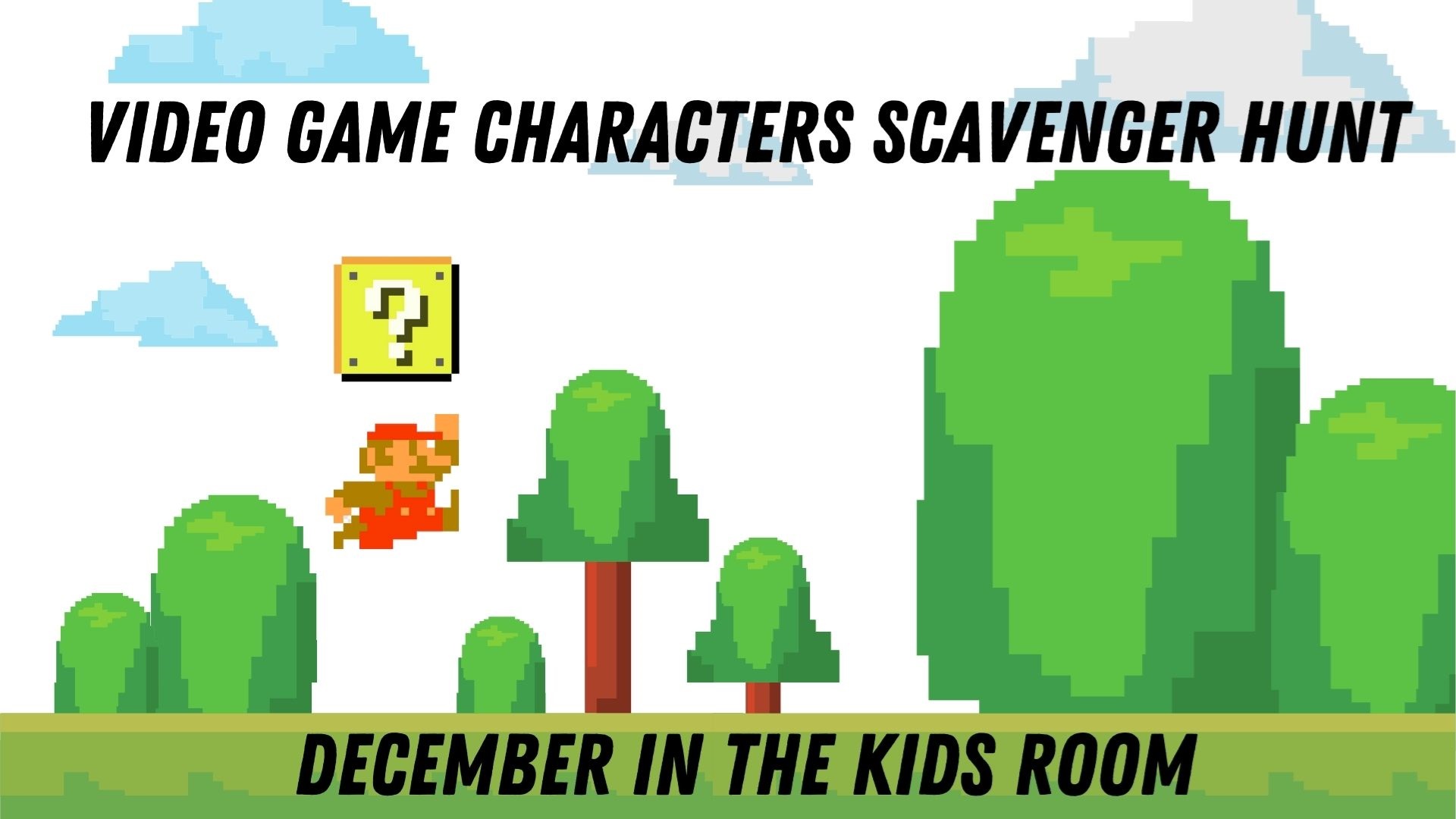 Video Game Characters Scavenger Hunt All month long Children's Room Find iconic video game characters hidden all around the children's room. No registration required.