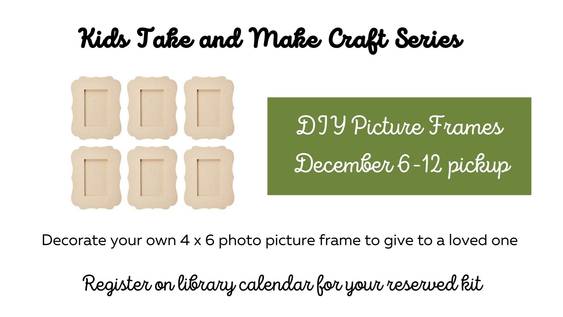 Take and Make Craft: DIY Picture Frames Pick Up Week December 6-12 Children's Room Decorate your very own 4 x 6 wooden photo frame. Registration is required prior to picking up your kit. Click here. Funded by the Friends of the Norwell Public Library
