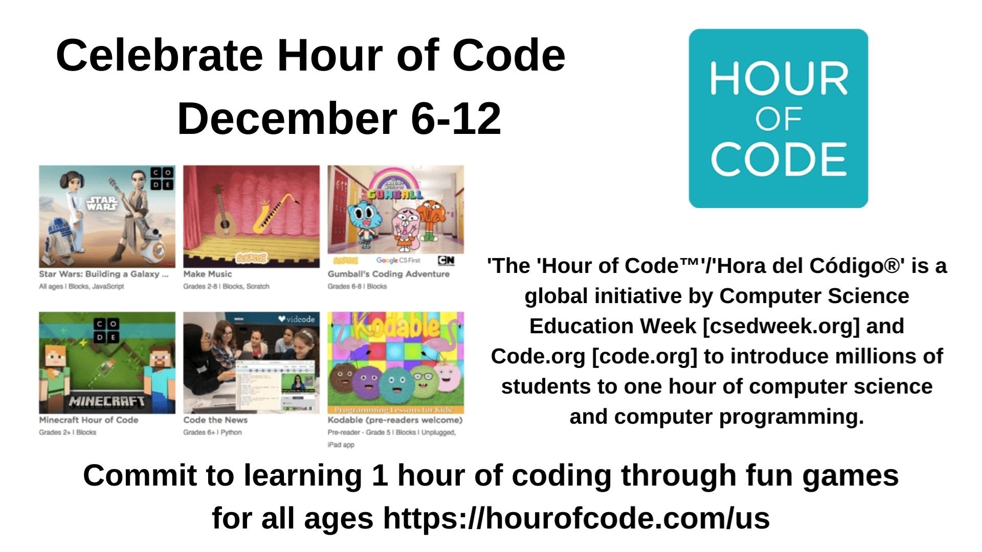 Hour of Code Week December 6-12 anytime Online 'The 'Hour of Code™'/'Hora del Código®' is a global initiative by Computer Science Education Week [csedweek.org] and Code.org [code.org] to introduce millions of students to one hour of computer science and computer programming for all ages through fun and engaging online games.