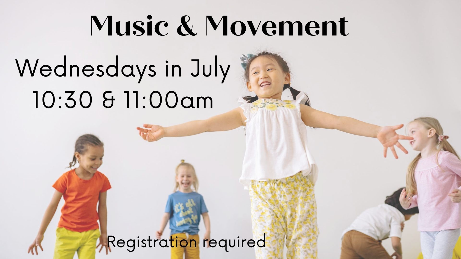 Music & Movement with Jessica Wednesdays 10:30-11:00am & 11:00-11:30am All ages Meeting Room Ages 0-5 are welcome to join Jessica for 30 minutes of participatory songs and fingerplays that support early literacy and get your body moving. Registration is required for each session. No class on Aug 24 & 31.