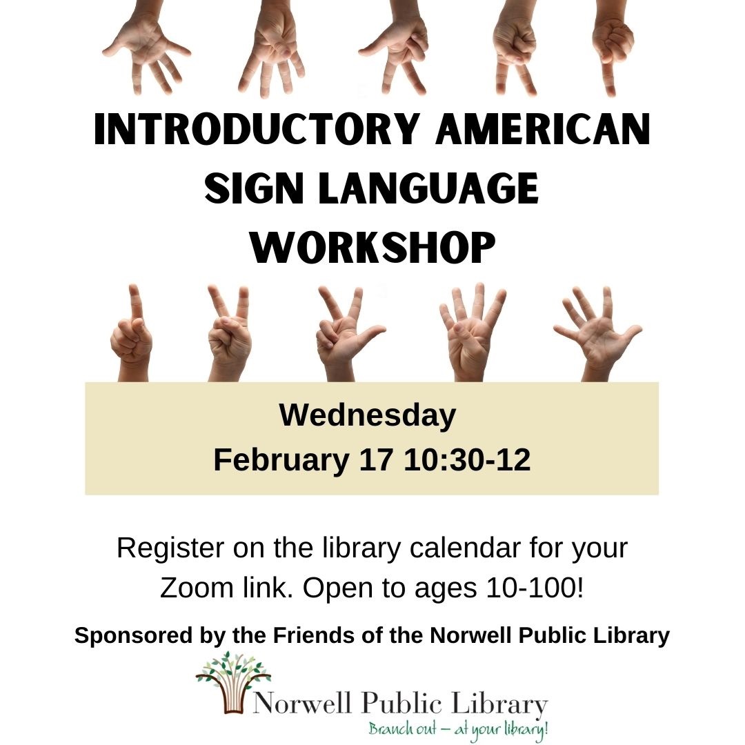Introductory American Sign Language Workshop Wednesday, February 17 10:30 AM to 12:00 PM Online Participation through Zoom If you have ever been curious about American Sign Language now is your chance! Open to ages 10 and up! Learn Introductory American Sign Language with certified ASL Interpreter Marianne Molinari.