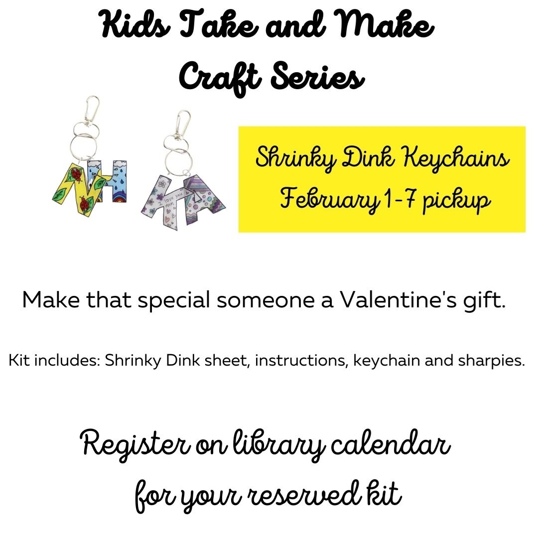 Grab and Go Take Home Kit: Shrinky Dink Keychains February 1 - February 7 During Curbside/Lobby Hours Make a keychain for someone special. Kit includes: Keychain, sharpies, shrinky dink sheet, and instructions. You will need: oven, baking sheet, scissors, parchment paper and hole punch (not included).